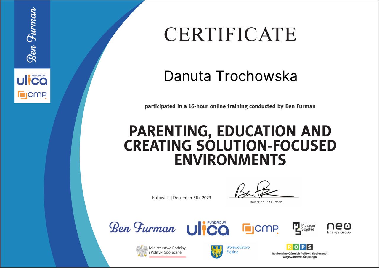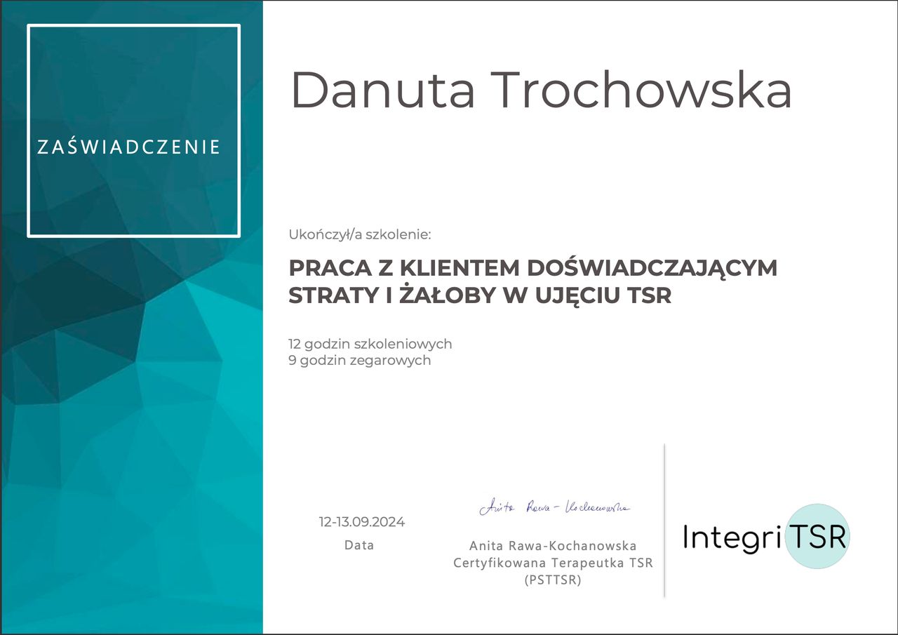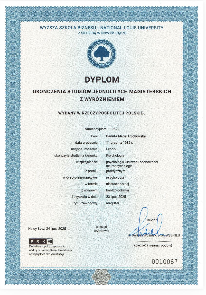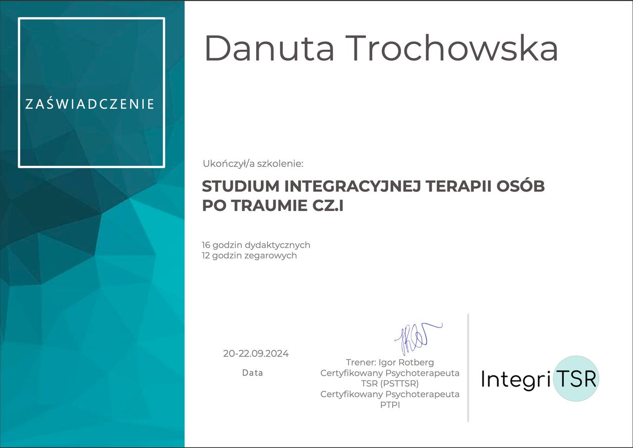Stale rozwijam swoje kompetencje, uczestniczę w szkoleniach i superwizji, aby zapewnić bezpieczną, rzetelną i profesjonalną pomoc. W pracy ważne są dla mnie relacja, zaufanie oraz indywidualne podejście do każdej osoby.