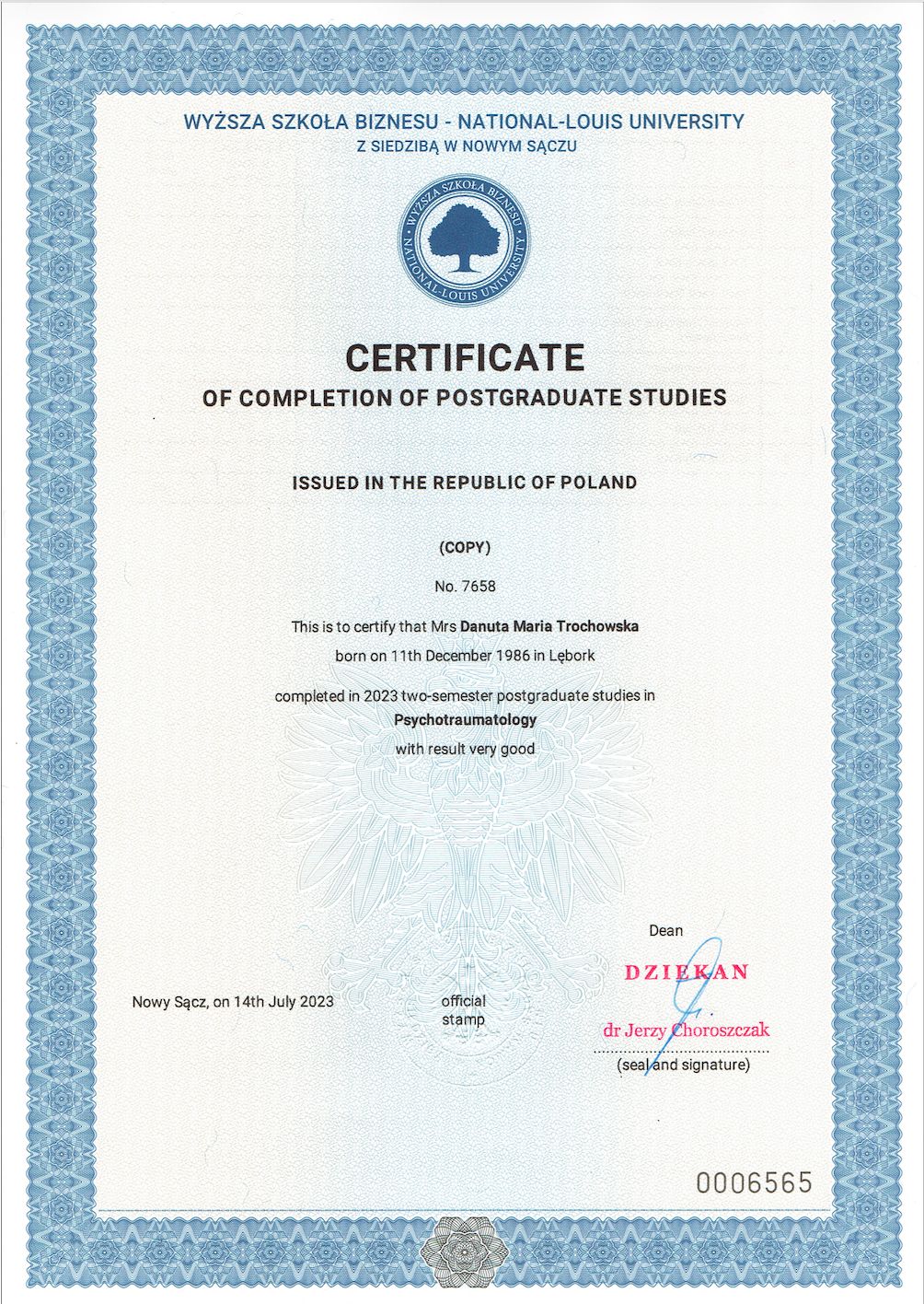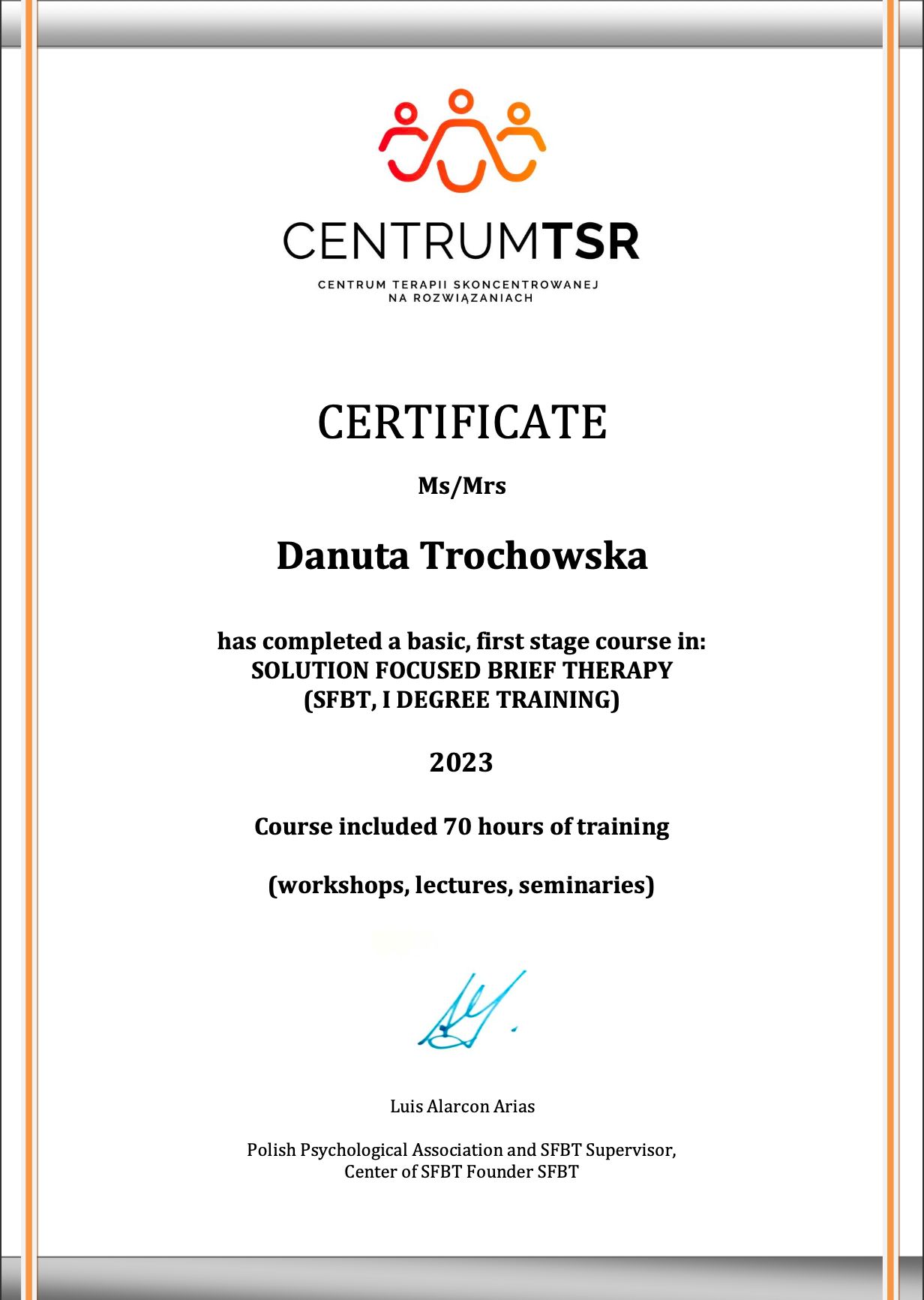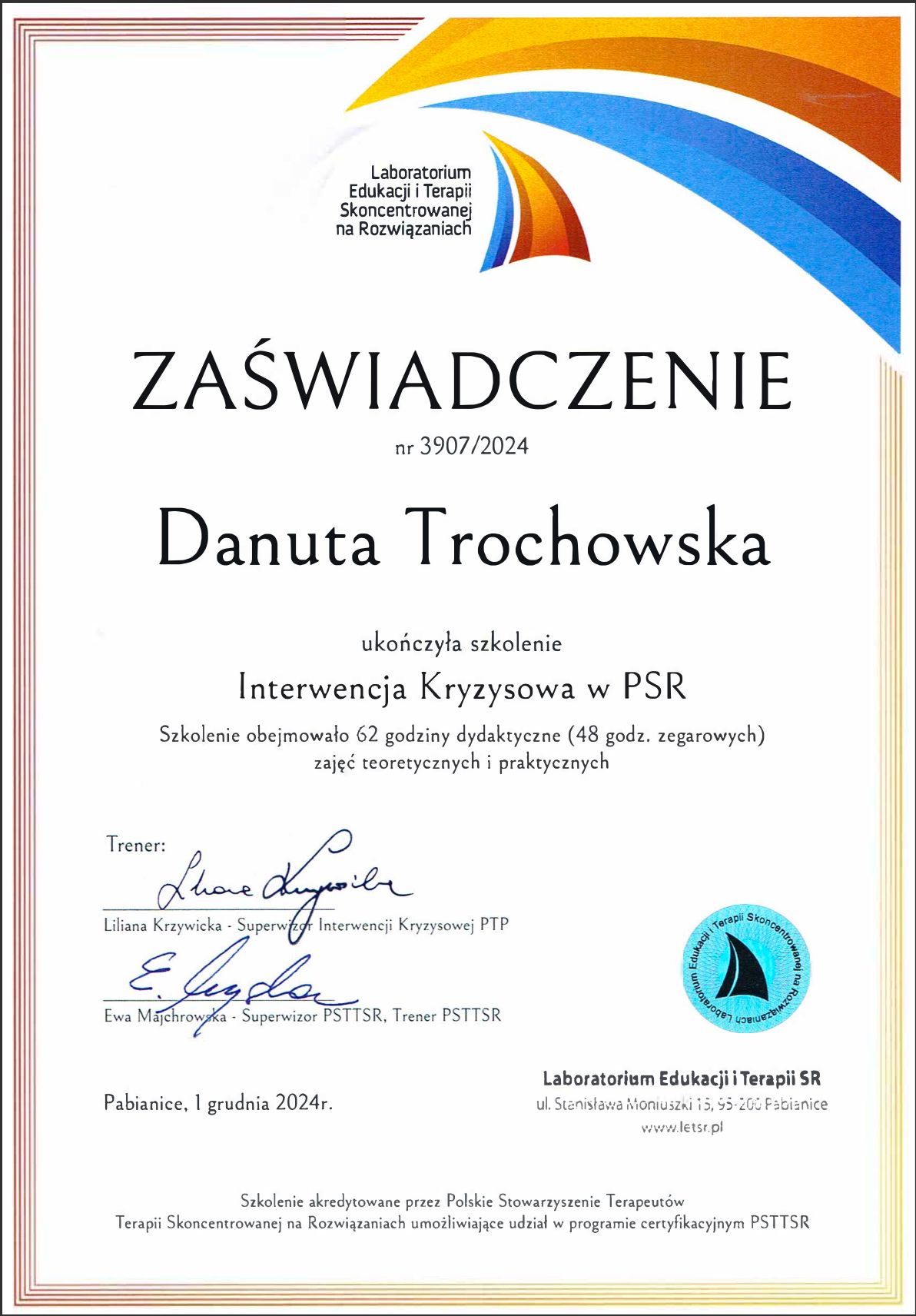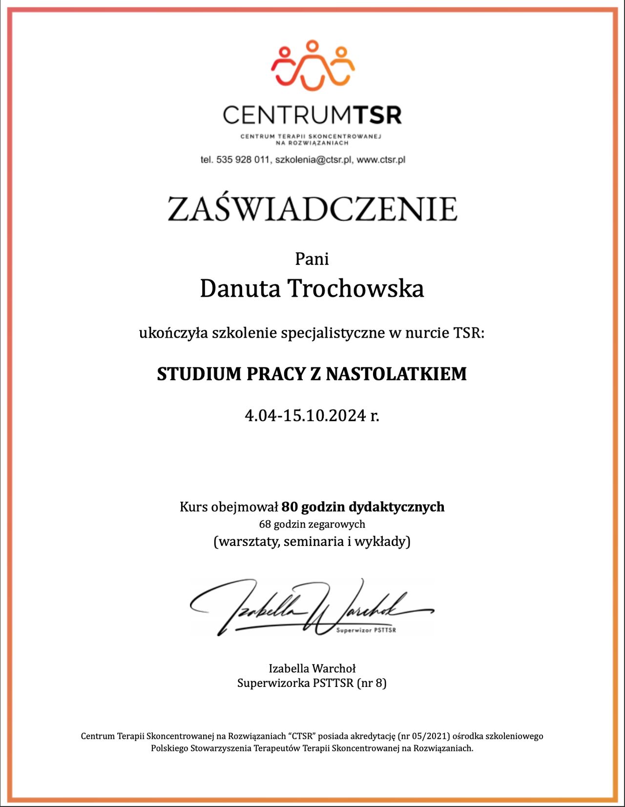 Stale rozwijam swoje kompetencje, uczestniczę w szkoleniach i superwizji, aby zapewnić bezpieczną, rzetelną i profesjonalną pomoc. W pracy ważne są dla mnie relacja, zaufanie oraz indywidualne podejście do każdej osoby.