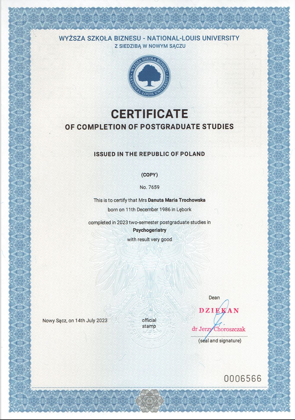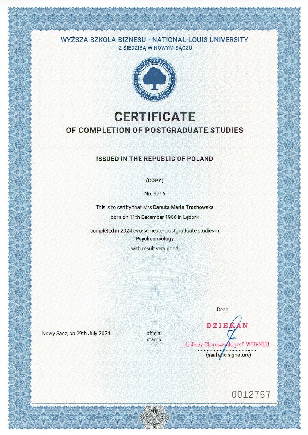 Posiadam także przygotowanie z zakresu psychoonkologii oraz psychogeriatrii (studia podyplomowe), dzięki czemu pracuję z osobami zmagającymi się z chorobą somatyczną, przewlekłym stresem zdrowotnym oraz z osobami starszymi i ich rodzinami.
