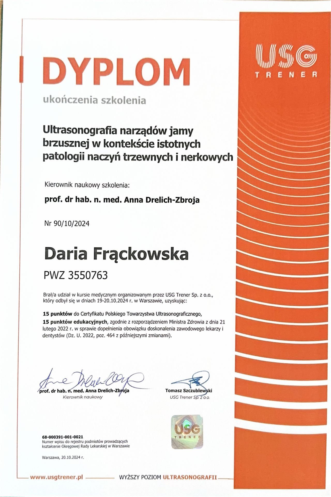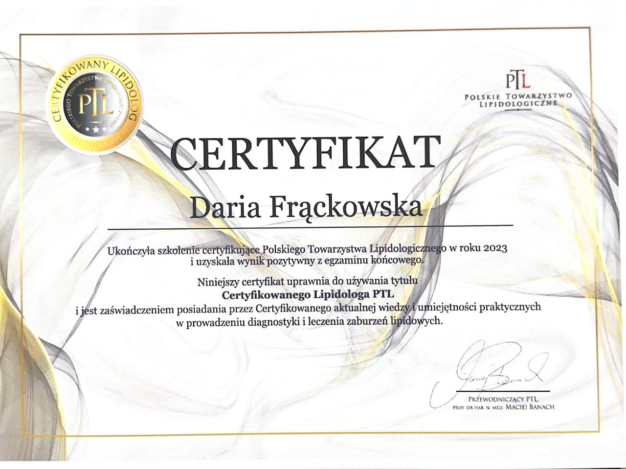 W roku 2022 ukończyłam studia podyplomowe „Dietetyka w chorobach wewnętrznych i metabolicznych” na Warszawskim Uniwersytecie Medycznym. Ukończyłam szkolenie z ultrasonografii dopplerowskiej naczyń obwodowych organizowanego przez Wielkopolską Szkołę Diagnostyki Obrazowej, a także kurs „Skleroterapia kompresyjna: diagnostyka, kwalifikacja, metody leczenia”. Uzyskałam certyfikat Polskiego Towarzystwa Lipidologicznego.