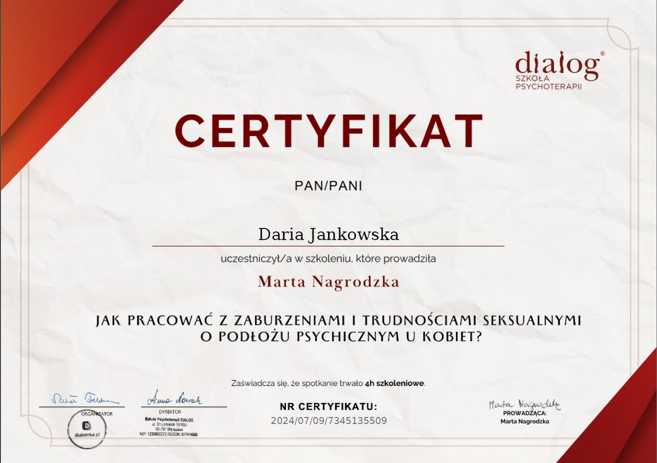 Czy Daria Jankowska przyjmuje online, bez konieczności pojawiania się w placówce?Nie, w tym momencie Daria Jankowska nie oferuje konsultacji online.