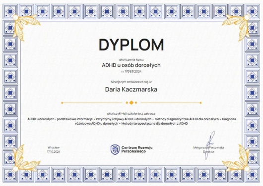 Pani Daria to niezwykle uważna i zaangażowana osoba, przy której od pierwszej chwili czuję się bezpiecznie i swobodnie. Cudownie słucha i daje mi przestrzeń do otwarcia się bez oceniania – mogę w pełni wyrażać swoje emocje, a ona zawsze prowadzi rozmowę z ogromnym taktem i empatią.
