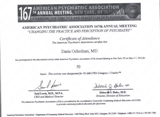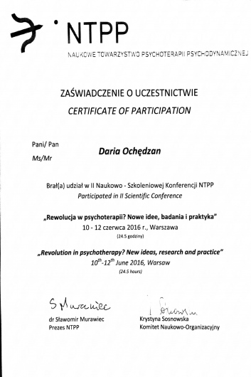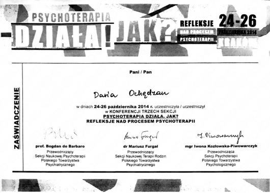 Swoją wiedzę wzbogacam udziałem w polskich i zagranicznych konferencjach psychiatrycznych. Należę do Polskiego Towarzystwa Psychiatrycznego.