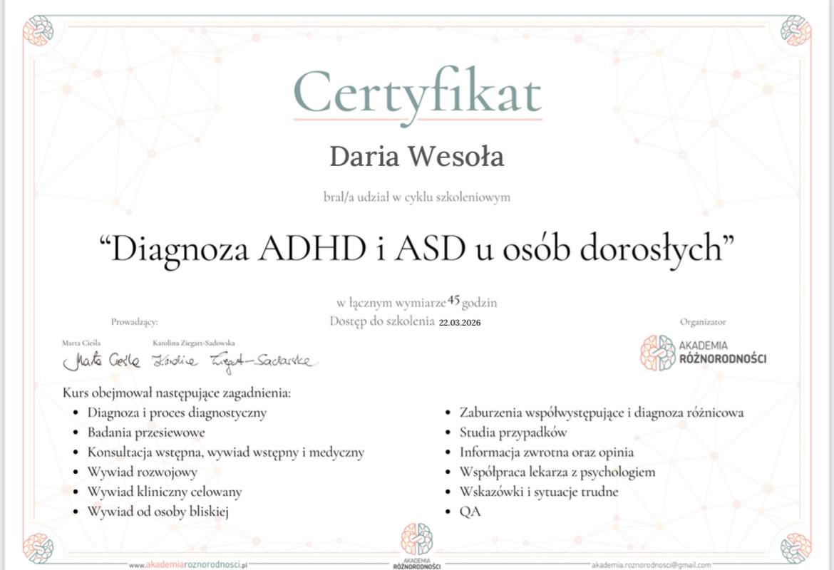 Czy Daria Wesoła przyjmuje online, bez konieczności pojawiania się w placówce?Tak, Daria Wesoła oferuje konsultacje online. Wybierz opcję „konsultacja online” przy umawianiu wizyty, a zobaczysz dostępne terminy.