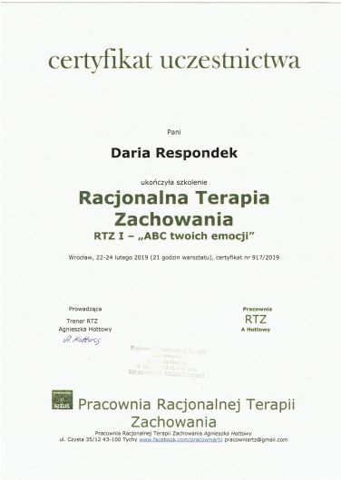 Jestem absolwentką studiów magisterskich na kierunku Psychologia na Uniwersytecie Humanistycznospołecznym SWPS we Wrocławiu oraz studiów podyplomowych z zakresu Pedagogiki na DSW we Wrocławiu. Obecnie jestem psychoterapeutką (na 4 roku) w trakcie całościowego 5-letniego kursu psychoterapii we Wrocławskim Instytucie Psychoterapii w nurcie systemowo-ericksonowskim. Ukończyłam Studium Psychoterapii Dzieci i Młodzieży we Wrocławskim Instytucie Psychoterapii oraz całościowe szkolenie Terapii krótkoterminowej Skoncentrowanej na Rozwiązaniach (BSFT) rekomendowane przez Polskie Stowarzyszenie Terapeutów TSR i przygotowujące do profesjonalnego prowadzenia terapii krótkoterminowej. Odbyłam specjalistyczne szkolenie z metody „Kids Skills – Dam radę!”. Ukończyłam również inne szkolenia terapeutyczne, m.in. z zakresu Racjonalnej Terapii Zachowania (RTZ), Porozumienia bez Przemocy (NVC), Terapii Poznawczo-Behawioralnej, arteterapii, pracy terapeutycznej z dziećmi, młodzieżą oraz osobami dorosłymi.