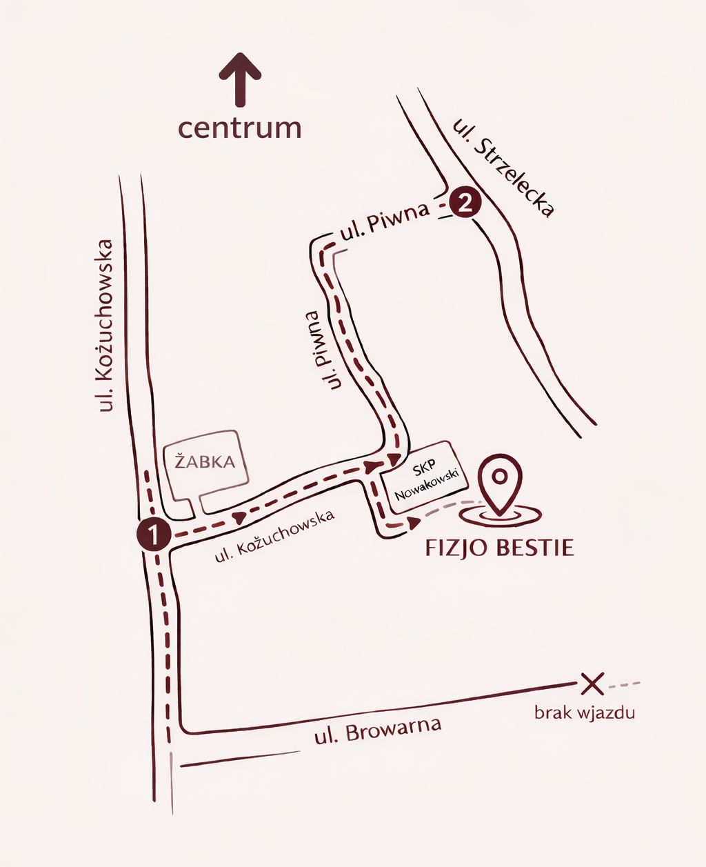 Wskazówki dotyczące dojazdu: wjazd od ulicy Kożuchowskiej przy sklepie Żabka (na przeciwko ul. Kosynierów). Mijając po lewej stronie Biegostację oraz siedzibę radia ESKA, jedziemy prosto wzdłuż torów, przejeżdżając pod ruinami dawnych Browarów Zachodnich. Po prawej stronie znajduje się parterowy budynek z logiem SKP Nowakowski. Wejście do gabinetu znajduje się na tyle budynku (lokal nr 4). W razie problemu zapraszam do kontaktu :)