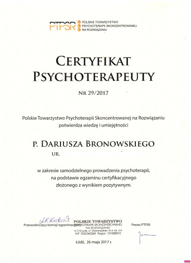 Jaki jest zakres porad oferowanych przez Dariusz Bronowski?Dariusz Bronowski to psycholog, psychoterapeuta certyfikowany. Na podstawie swojego doświadczenia i wykształcenia Dariusz Bronowski oferuje usługi takie jak: Psychoterapia, psychoterapia par i małżeństw online, psychoterapia indywidualna, psychoterapia par i małżeństw, psychoterapia rodzinna.