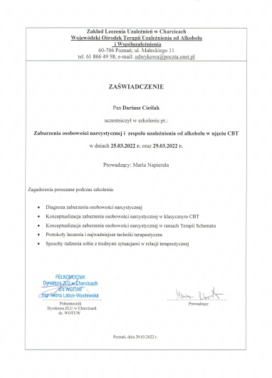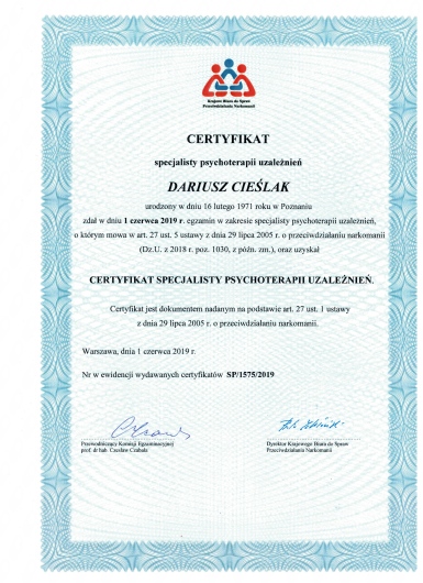 Zasady współpracy: W ramach obustronnego szacunku do siebie, uprzejmie proszę o przestrzeganie zasady, że jeżeli zarezerwujecie Państwo sesję w terminarzu Znanego Lekarza i mimo wszystko zrezygnujecie z sesji lub zmienicie jej termin, najpóźniej na 24h przed terminem nie ponosicie Państwo kosztów sesji. Jeżeli jednak rezygnacja lub zmiana terminu nastąpi w dniu rezerwacji to uprzejmie proszę Państwa o opłatę kosztu sesji terapeutycznej. 1. Sesja trwa 50 minut. 2. Płatność za sesję można regulować gotówką, ale może też płatnością BLIK na nr tel: 514-919-664, lub przelewem na moje konto: 45 1140 2004 0000 3502 5375 6449. Bardzo proszę o dopisek kogo dotyczyła sesja I KIEDY SIĘ ODBYŁA. 3. Uprzejmie proszę o przychodzenie na sesję o pełnej godzinę; niestety nie mamy poczekalni dla Państwa :/ 4. Uprzejmie proszę Państwa o zapoznanie się z zasadami współpracy zwłaszcza dotyczącymi ODWOŁYWANIA i ZMIENIANIA terminu umówionych sesji terapeutycznych. Poza tym... Jestem socjologiem, certyfikowanym specjalistą psychoterapii uzależnień, a od 2020 roku w trybie niestacjonarnym studiuję na kierunku Psychologia Kliniczna. Wcześniej pracowałem w Ośrodku dla osób uzależnionych „New Life Center” w Długiej Goślinie, w Ośrodku Leczenia, Terapii i Rehabilitacji Uzależnień „MONAR” w Rożnowicach i w prywatnym Ośrodku Leczenia Uzależnień i Współuzależnienia – „Moje Życie” w Skórzewie. Obecnie pracuję w Wojewódzkim Ośrodku Terapii Uzależnień i Współuzależnień w Poznaniu. Od 2010 roku pracuję z osobami borykającymi się z różnymi formami (a) uzależnienia, (b) współuzależnienia i z mechanizmami adaptacyjnymi typu (c) DDA, czy DDD, d) pracuję również z osobami w kryzysie zarówno singlami jak i osobami w związkach. Moje motto w pracy terapeutycznej brzmi: „Terapia to przede wszystkim wprowadzanie zmian!”. Psychoedukację postrzegam jako narzędzie do wprowadzania zmian. Bez zmian, proces terapeutyczny jest tylko gromadzeniem wiedzy, która niczego nie zmieni. Uwaga! Nie zawsze jest odpowiedni czas na wprowadzanie zmian, niekiedy trzeba się zatrzymać by spokojnie się rozejrzeć i upewnić w jakim kierunku chcecie Państwo iść. A potem iść – wprowadzając zmiany :-) a) W pracy z osobami uzależnionymi skupiam się nie tyle co na redukcji szkód czy objawów, ale raczej ich przyczyn. Uzależnienie powstaje na kilka sposobów, nie zawsze jest skutkiem choroby, może też być wynikiem złych nawyków, uświadomienie sobie tego uwalnia do koncentracji uwagi w procesie terapeutycznym na właściwy obszarze problemowy. W przeciwnym razie proces stoi w miejscu i z czasem staje się bardziej źródłem frustracji, niż satysfakcji. b) Ponieważ uzależnienie dotyczy nie tylko osoby uzależnionej, ale także jej najbliższych, pracuję też z osobami współuzależnionym, czyli z tymi, które na przestrzeni lat życia z osobą uzależnioną przyswoiły sobie mechanizmy adaptacyjne pozwalające im żyć w takim związku. Te mechanizmy zawsze działają ze szkodą dla współuzależnionych, to znaczy ze szkodą dla ich poczucia wartości, zaspokojenia osobistych potrzeb, zadbania o bezpieczne dla siebie granice i można by tak jeszcze długo wymieniać. Dość powiedzieć, że te mechanizmy współuzależnienia nie działają na dłuższą metę i nie działają w środowisku ludzi zdrowych. Dlatego w pracy z osobami współuzależnionymi, pracuję nad identyfikacją tych mechanizmów, gdzie Pacjent zastępuje je nowym sposobem myślenia o sobie i sobie w tym świecie, a poprzez wyznaczanie bezpiecznych dla siebie granic, zmierza do budowy swojej nowej trwałej i zintegrowanej osobowości. c) Z osobami dotkniętymi skutkami mechanizmu adaptacyjnego typu DDA (Dorosłe Dzieci Alkoholików) i DDD (Dorosłe Dzieci z Rodzin Dysfunkcyjnych), pracuję nad identyfikacją tych mechanizmów, uświadomieniem sobie ich natury i budowaniu zachowań obronnych służących budowaniu nowej, trwałej i zintegrowanej osobowości. Uwaga! Nie każda osoba wychowująca się w rodzinie z problemem, z automatu jest dotknięta w podobnym stopniu, takimi samymi skutkami jak inne osoby w takiej samej sytuacji. Nie rzadko zaburzenia adaptacyjne i zaburzenia osobowości, mogą mieć różne pochodzenie. Dlatego w pracy z osobami zmagającymi się z trudnościami adaptacyjnymi istotna jest właściwa diagnoza genezy tych zjawisk. d) W pracy z osobami znajdującymi się w kryzysie, dbam o zapewnienie Pacjentowi poczucia bezpieczeństwa i bycia zrozumianym. Stawiam na budowanie relacji terapeutycznej, która jest zasadniczym czynnikiem leczącym w psychoterapii. Każdy kryzys postrzegam jako ważną informację, która gdy jest właściwie odebrana, może stać się podstawą do rozwoju, być może na nowo, być może w nowym miejscu. W pracy z Pacjentem głownie pracuję sobą i kontaktem z sobą, dlatego bliskie jest mi podejście psychodynamiczne, chociaż to podejście jest bardzo popularne, to jednak nie zawsze się sprawdza, dlatego w swojej pracy nie stronię od podejścia integratywnego, dobierając optymalnie najlepsze techniki i metody do pracy z konkretnym Pacjentem. A ponieważ obszar pracy dotyczący szeroko rozumianych relacji jest mi szczególnie bliski, trzecim nurtem z jakiego korzystam jest nurt systemowy. Często pytacie Państwo: "Jak często powinny się odbywać sesje?" To zależy od zakresu pomocy jakiej Państwo potrzebujecie. - Czasami wystarczy jedna konsultacja i wszystko staje się jasne. - W przypadku uzależnień sugeruję 1 sesję na tydzień, rzadziej 1 na dwa tygodnie. Jak długo powinna trwać terapia? Rzecz w tym, żebyście Państwo dostali to czego potrzebujecie i od razu zaczęli używać tego w swoim życiu. Chodzi bowiem o to, żebyście się Państwo nie uzależniali od specjalistów, ale sami stali się specjalistami w swoim życiu - bo w rzeczy samej nimi jesteście! Tyle założenia, a w praktyce p