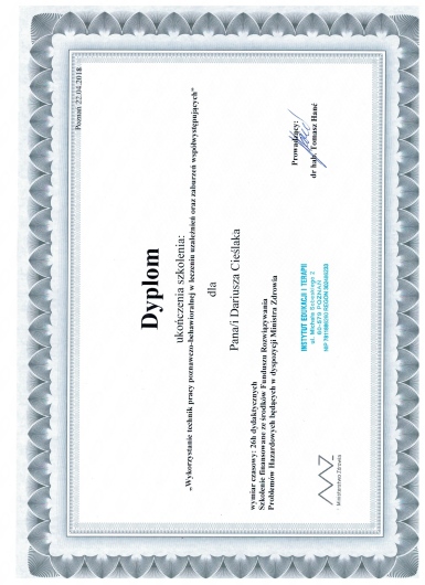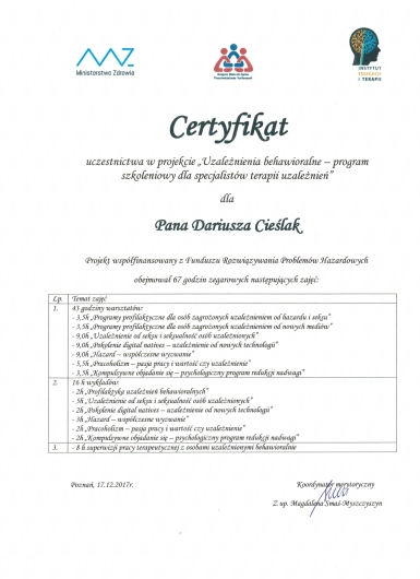 Jaki jest zakres porad oferowanych przez Dariusz Cieślak?Dariusz Cieślak to psychoterapeuta certyfikowany. Na podstawie swojego doświadczenia i wykształcenia Dariusz Cieślak oferuje usługi takie jak: konsultacja psychoterapeutyczna, psychoterapia uzależnień, psychoterapia współuzależnienia, terapia uzależnień, Psychoterapia uzależnień i współuzależnienia, konsultacja przez telefon, konsultacja online.