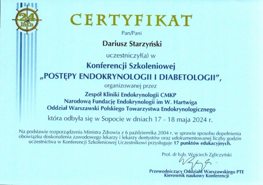 Jaki jest zakres porad oferowanych przez Dariusz Starzyński?Dariusz Starzyński to endokrynolog. Na podstawie swojego doświadczenia i wykształcenia Dariusz Starzyński oferuje usługi takie jak: Konsultacja endokrynologiczna, konsultacja endokrynologiczna + USG tarczycy.
