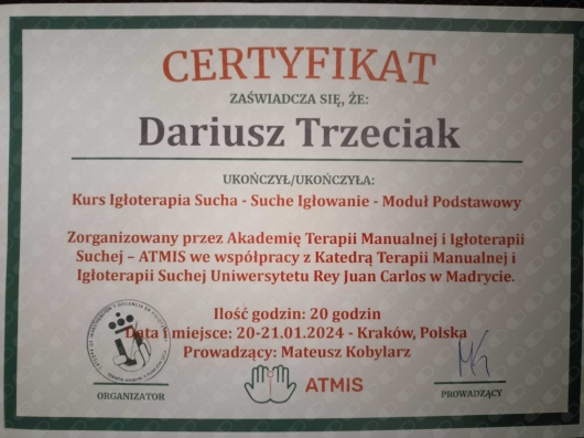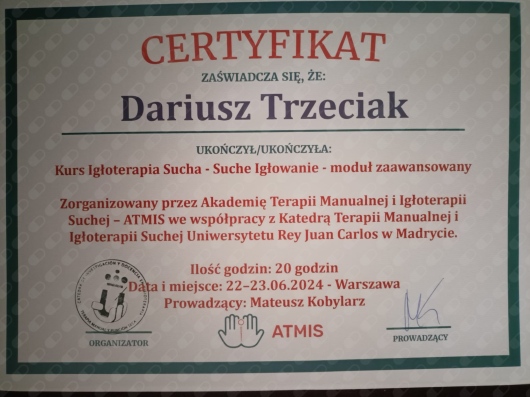 Jaki jest zakres porad oferowanych przez Dariusz Trzeciak?Dariusz Trzeciak to fizjoterapeuta. Na podstawie swojego doświadczenia i wykształcenia Dariusz Trzeciak oferuje usługi takie jak: konsultacja fizjoterapeutyczna, kinesiotaping, rehabilitacja ortopedyczna, ćwiczenia indywidualne, ćwiczenia, wizyta fizjoterapeutyczna, trening funkcjonalny, terapia mięśniowo-powięziowa, Dry Needling suche igłowanie, Terapia bólu.