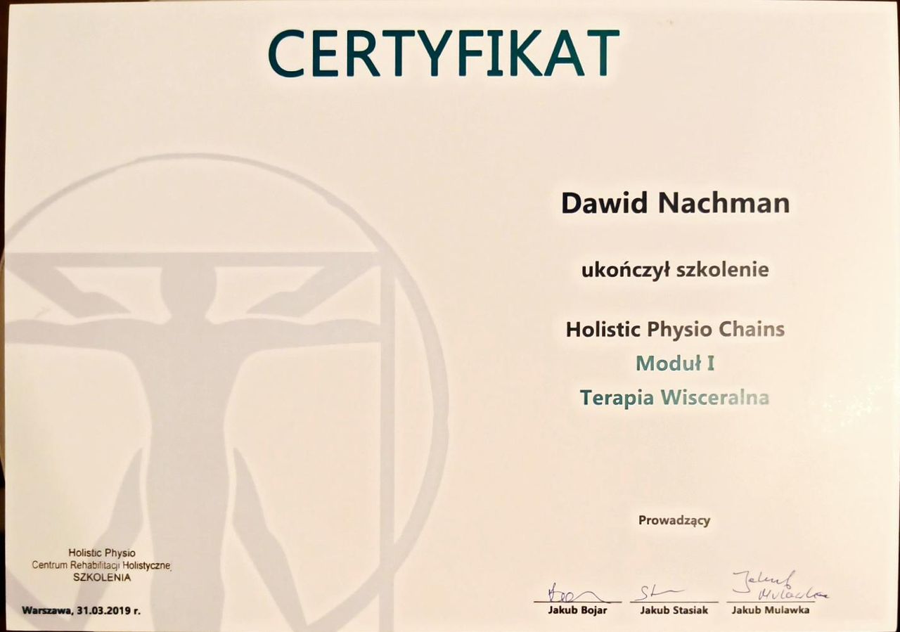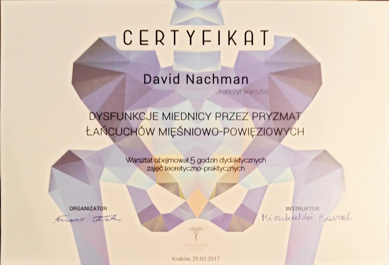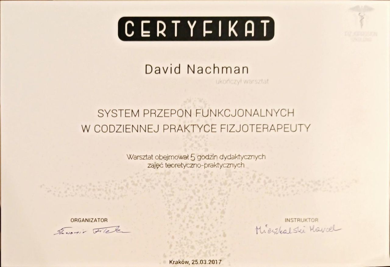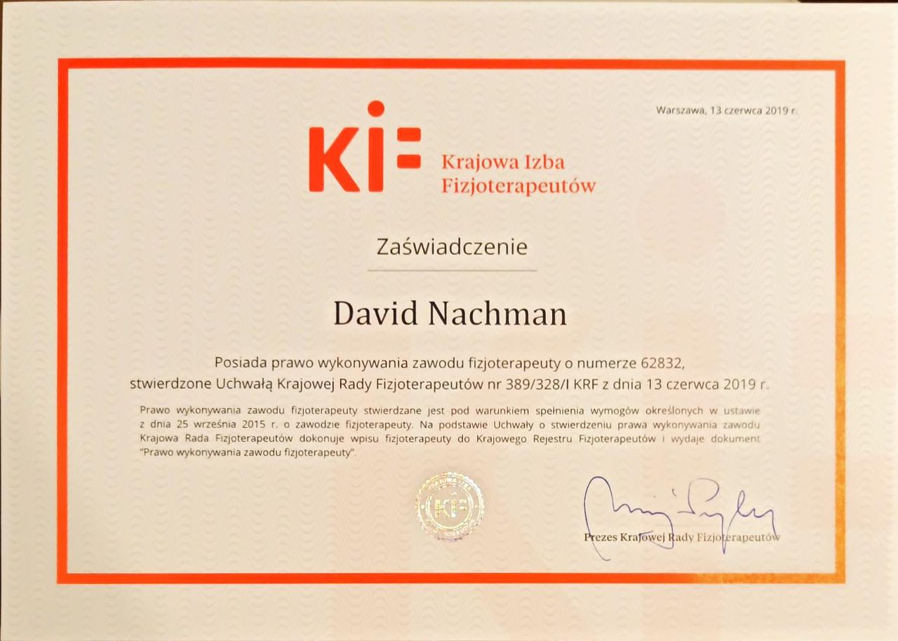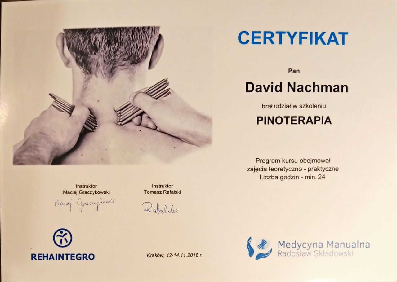Jaki jest zakres porad oferowanych przez David Nachman?David Nachman to fizjoterapeuta. Na podstawie swojego doświadczenia i wykształcenia David Nachman oferuje usługi takie jak: terapia mięśniowo-powięziowa, Terapia tkanek miękkich, taping (plastrowanie), fizjoterapia, Fizjoterapia dyskopatii w ostrym stanie, rehabilitacja sportowców, suche igłowanie, konsultacja fizjoterapeutyczna, konsultacja fizjoterapeutyczna + USG, rehabilitacja ortopedyczna.