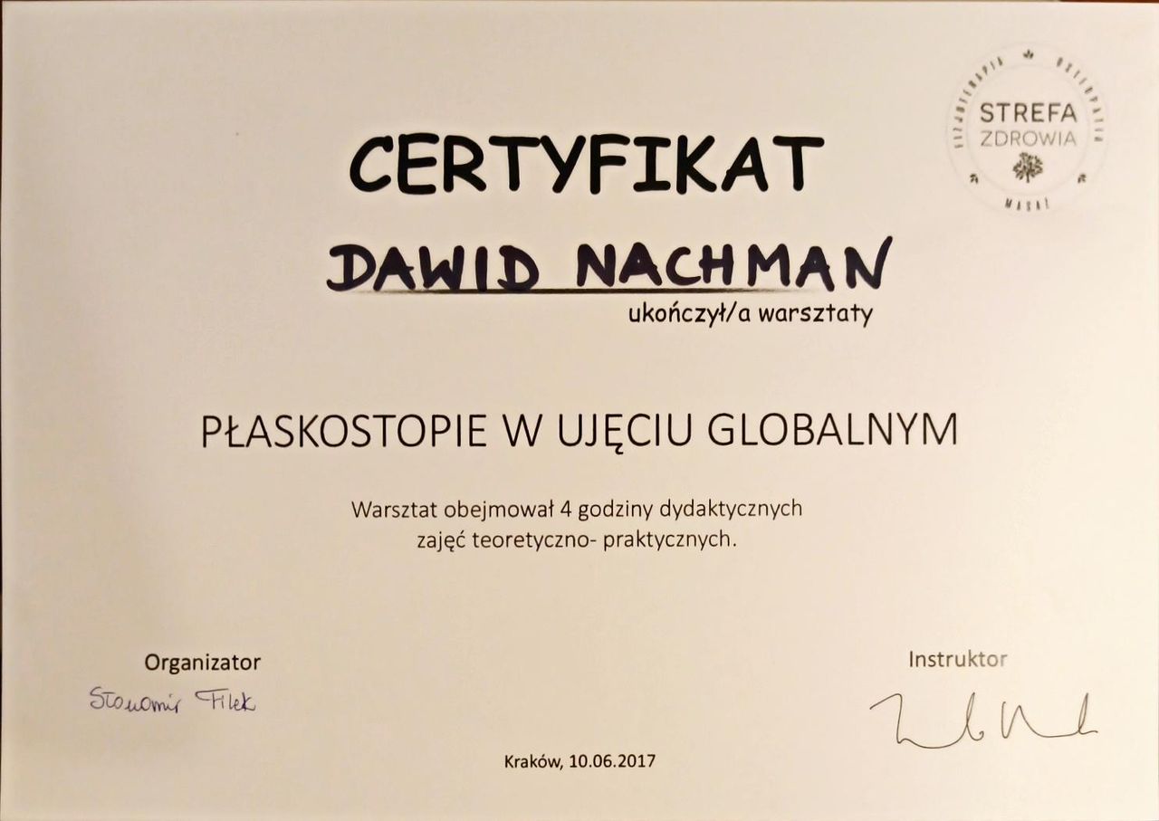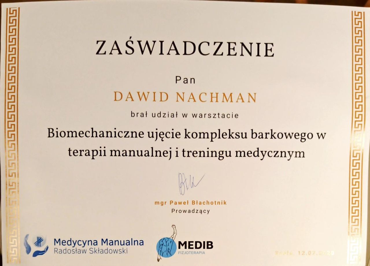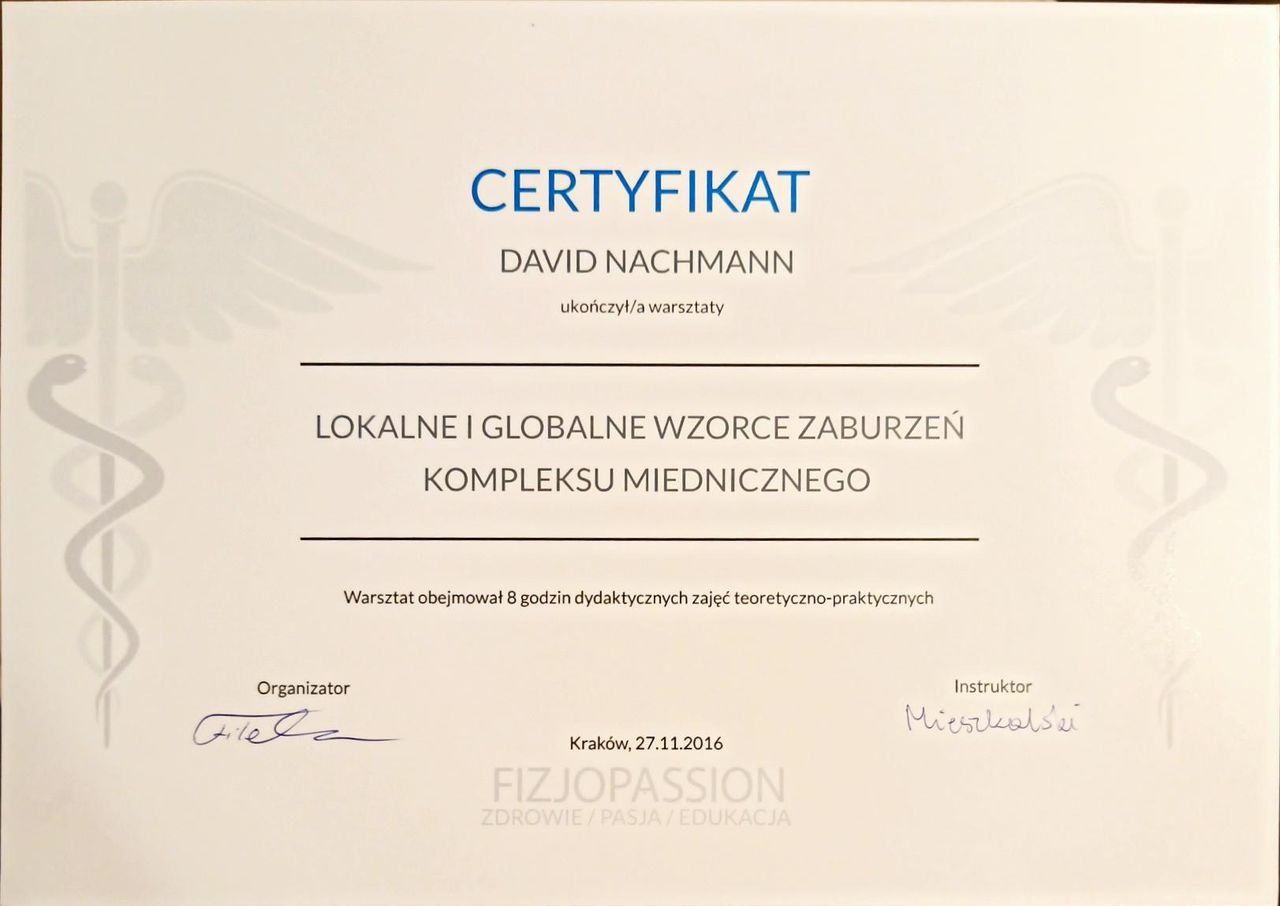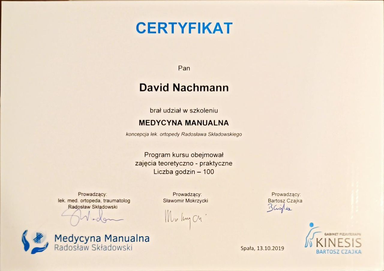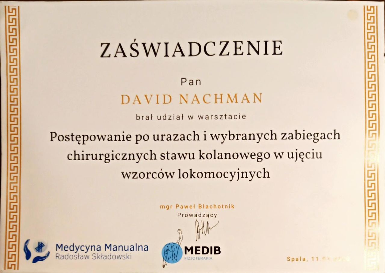 Jaki jest zakres porad oferowanych przez David Nachman?David Nachman to fizjoterapeuta. Na podstawie swojego doświadczenia i wykształcenia David Nachman oferuje usługi takie jak: terapia mięśniowo-powięziowa, Terapia tkanek miękkich, taping (plastrowanie), fizjoterapia, Fizjoterapia dyskopatii w ostrym stanie, rehabilitacja sportowców, suche igłowanie, konsultacja fizjoterapeutyczna, konsultacja fizjoterapeutyczna + USG, rehabilitacja ortopedyczna.