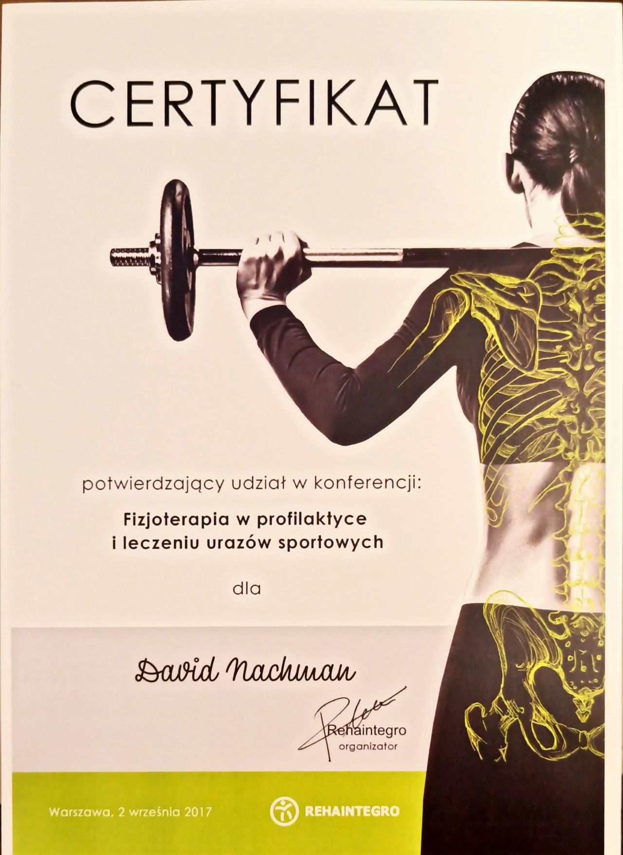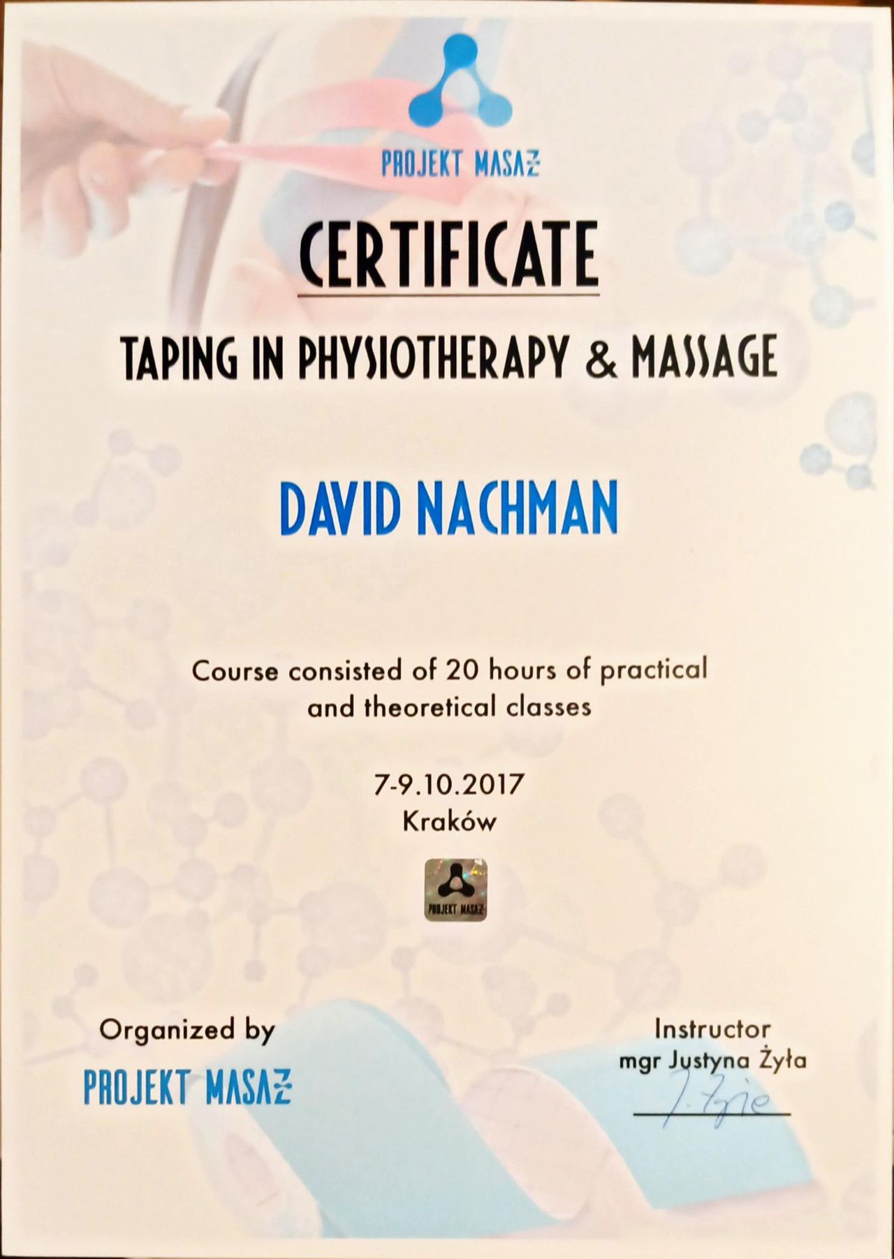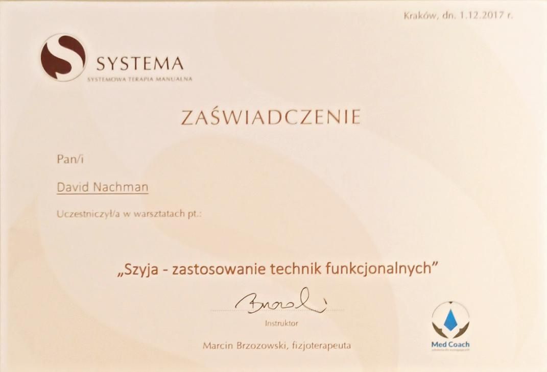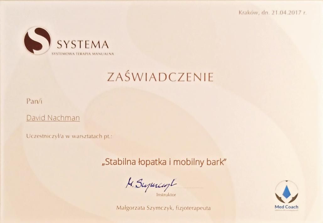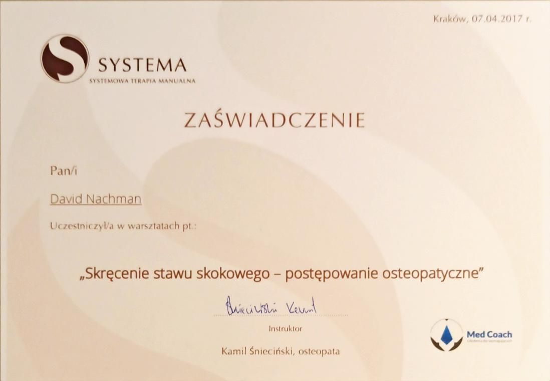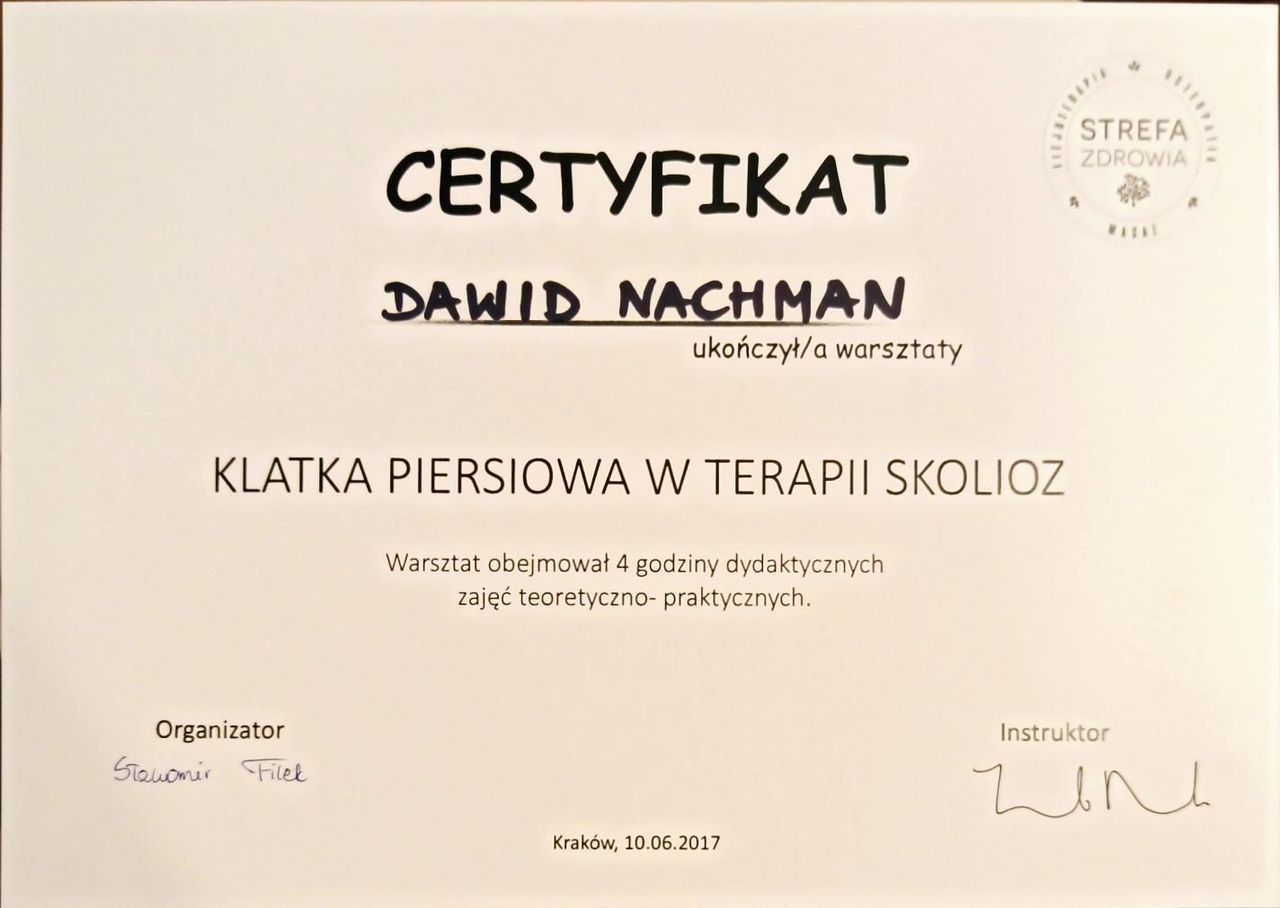 Jaki jest zakres porad oferowanych przez David Nachman?David Nachman to fizjoterapeuta. Na podstawie swojego doświadczenia i wykształcenia David Nachman oferuje usługi takie jak: terapia mięśniowo-powięziowa, Terapia tkanek miękkich, taping (plastrowanie), fizjoterapia, Fizjoterapia dyskopatii w ostrym stanie, rehabilitacja sportowców, suche igłowanie, konsultacja fizjoterapeutyczna, konsultacja fizjoterapeutyczna + USG, rehabilitacja ortopedyczna.