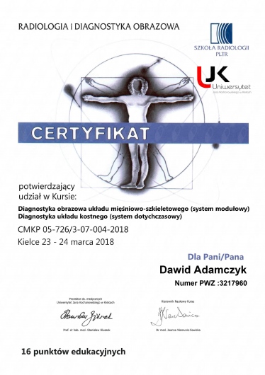 Wykonywanie badań USG jest jego pasją oraz jednym z głównych rodzajów działalności zawodowej. Ukończył liczne szkolenia w renomowanych ośrodkach potwierdzone certyfikatami. Uczestnik konferencji oraz zjazdów naukowych z dziedziny Radiologii i Diagnostyki Obrazowej.