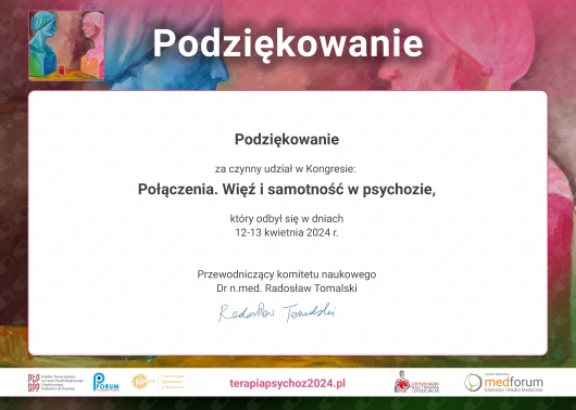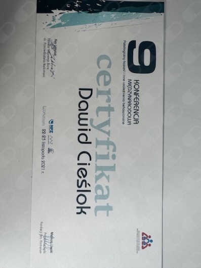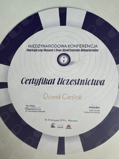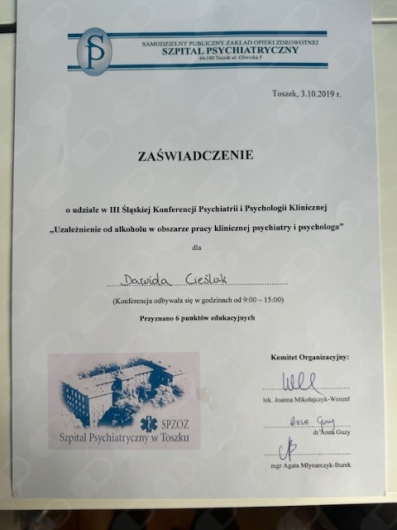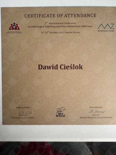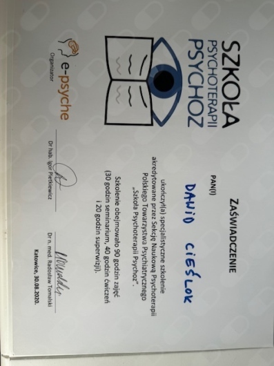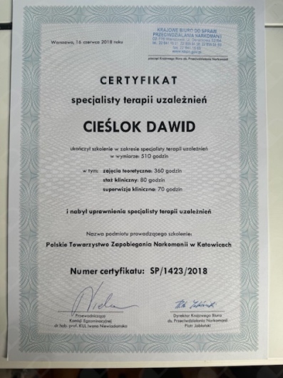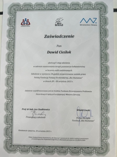 Jestem certyfikowanym Specjalistą Psychoterapii Uzależnień. Ukończyłem Szkołę Psychoterapii Psychoz atestowaną przez Polskie Towarzystwo Psychiatryczne. Uczestniczyłem w konferencjach i szkoleniach z obszaru kryzysu psychicznego, uzależnienia od substancji psychoaktywnych, uzależnień czynnościowych.Jestem członkiem Polskiego Towarzystwa na rzecz Psychologicznego i Społecznego Podejścia do Psychoz.