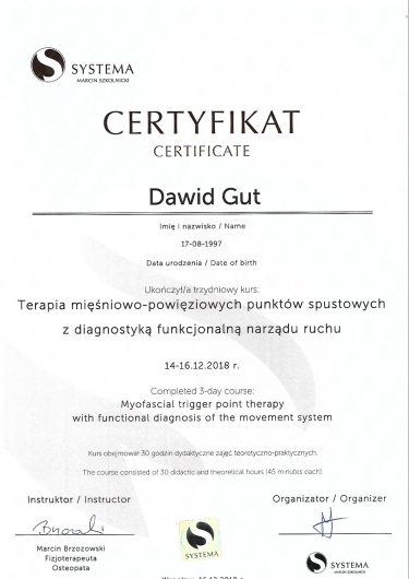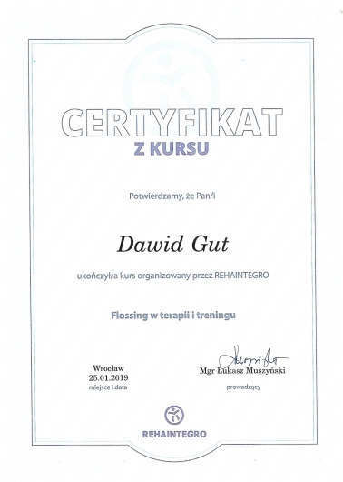 Jaki jest zakres porad oferowanych przez Dawid Gut?Dawid Gut to fizjoterapeuta. Na podstawie swojego doświadczenia i wykształcenia Dawid Gut oferuje usługi takie jak: elektrostymulacja, konsultacja fizjoterapeutyczna, osteopatia, Terapia manualna, terapia mięśniowo-powięziowa, Terapia tkanek miękkich, terapia wisceralna, Fizjoterapia pourazowa, fizjoterapia kobiet w ciąży / fizjoterapia okołoporodowa, Fizjoterapia z wykorzystaniem technik osteopatycznych.