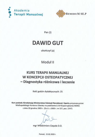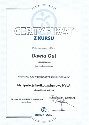 Pan Dawid Gut to wyjątkowy fizjoterapeuta i osteopata. Już od pierwszej wizyty czuć jego pełne skupienie i zaangażowanie. Ma ogromną wiedzę i świetne wyczucie ciała oraz emocji – pomógł mi uwolnić nagromadzony stres i napięcia, których nie potrafiłam się pozbyć od dłuższego czasu. Pracuje z niezwykłą delikatnością i szacunkiem do pacjenta. Bardzo dziękuję za pomoc i z całego serca polecam! Do zobaczenia ponownie.