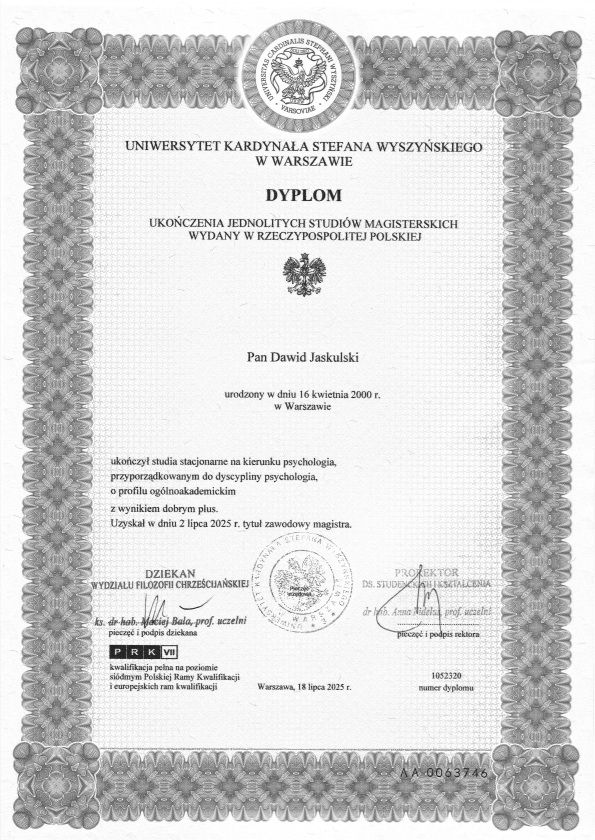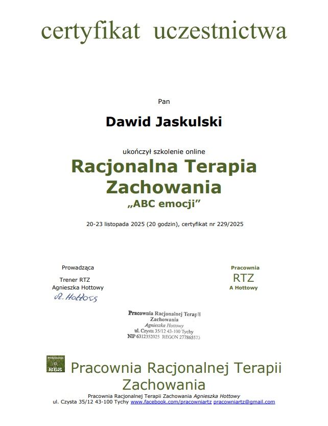 Jestem psychologiem w trakcie 4-letniej Szkoły Psychoterapii poznawczo-behawioralnej. Przyjmuję pacjentów zmagających się z kryzysami życiowymi, uzależnieniami, stanami depresyjnymi, lękowymi i wieloma innymi. Odbyłem staż psychologiczny w Mazowieckim Szpitalu Psychiatrycznym ,,Drewnica" oraz w Przedszkolu Terapeutycznym SOTIS. Posiadam również certyfikat ukończenia szkolenia RTZ (Racjonalnej Terapii Zachowania) pracowni Agnieszki Hottowy oraz certyfikat ukończenia kursu o możliwościach zastosowania terapii poznawczo-behawioralnej w leczeniu zespołu nadpobudliwości psychoruchowej (ADHD). Szczególnym obszarem moich zainteresowań są zaburzenia osobowości tj. zaburzenie osobowości typu Borderline, zaburzenia nastroju oraz ADHD.