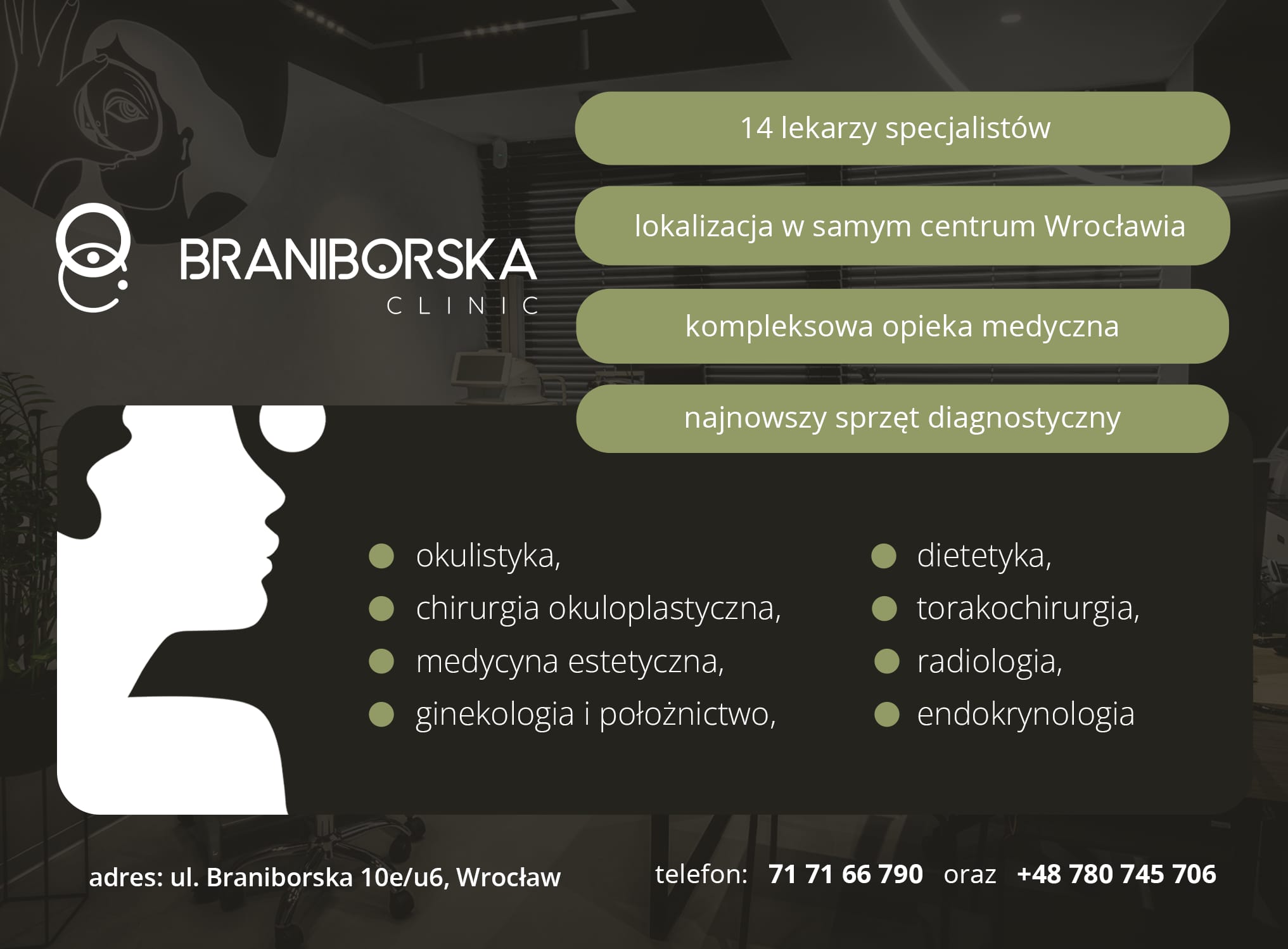 Braniborska Clinic to nowoczesna wielospecjalistyczna placówka medyczna zlokalizowana w samym centrum Wrocławia. Nasz wykwalifikowany personel od wielu lat z pasją i zaangażowaniem troszczy się o zdrowie swoich pacjentów. Oferujemy kompleksową opiekę medyczną opartą na wieloletnim doświadczeniu klinicznym. Dysponujemy najnowocześniejszym sprzętem do diagnostyki i leczenia w tym salą zabiegową do wykonywania procedur medycznych.