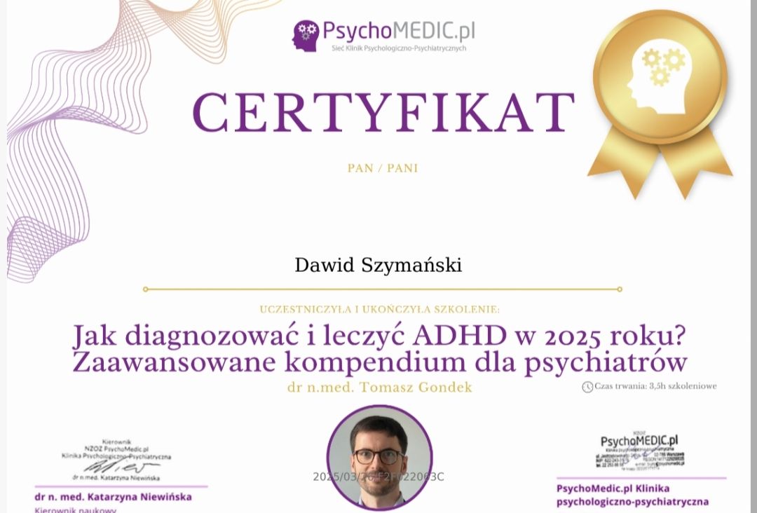 Czy Dawid Szymański przyjmuje online, bez konieczności pojawiania się w placówce?Tak, Dawid Szymański oferuje konsultacje online. Wybierz opcję „konsultacja online” przy umawianiu wizyty, a zobaczysz dostępne terminy.