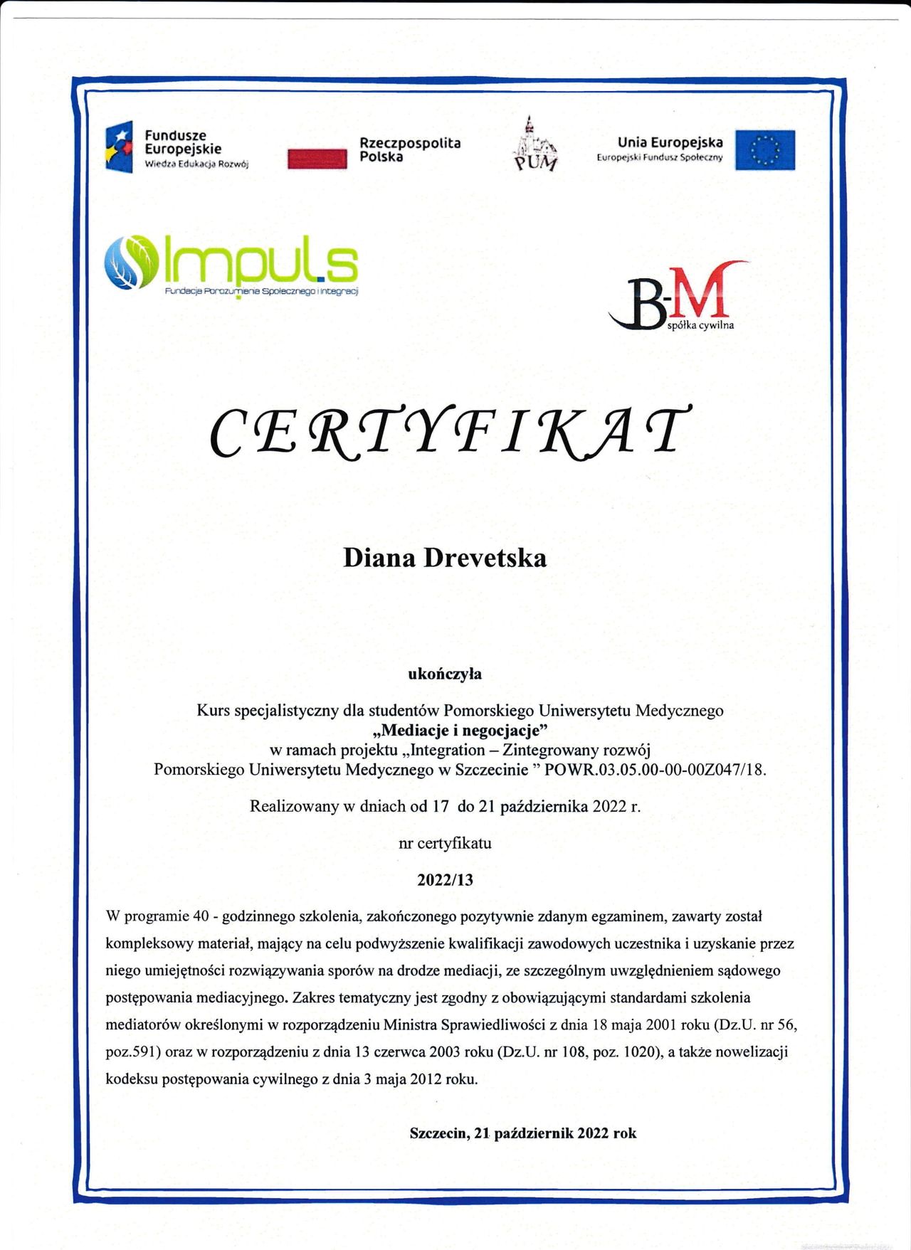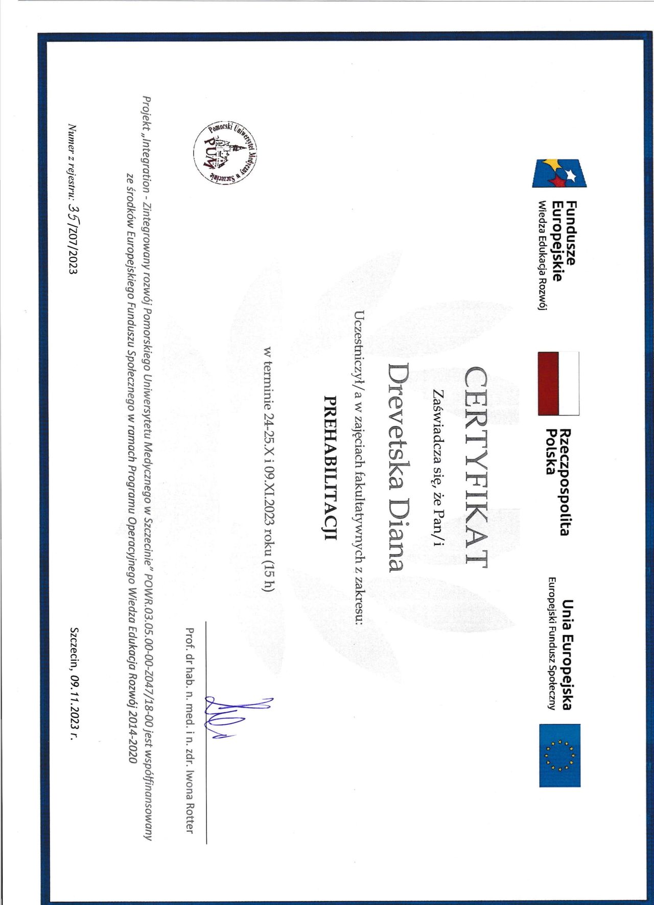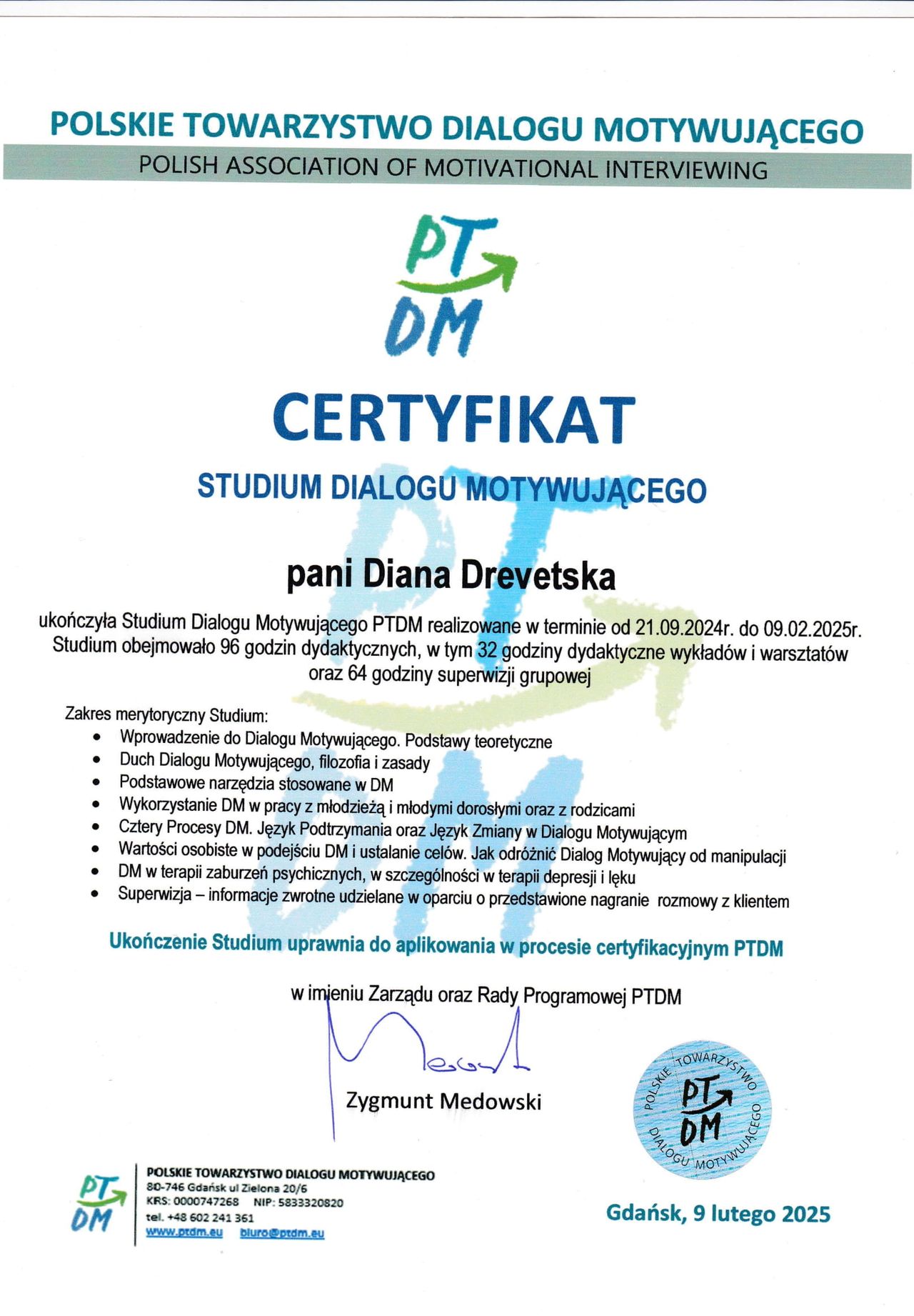 Ukończyłam Studium Dialogu Motywującego organizowane przez Polskie Towarzystwo Dialogu Motywującego i aktywnie stosuję tę metodę, wspierając pacjentów w procesie zmiany. W pracy korzystam również z technik uważności (MBSR – Mindfulness Based Stress Reduction), które wspomagają proces terapeutyczny i pomagają w regulacji emocji. Ukończony kurs z prehabilitacji pozwala mi także wspierać osoby przygotowujące się do leczenia lub zabiegów.