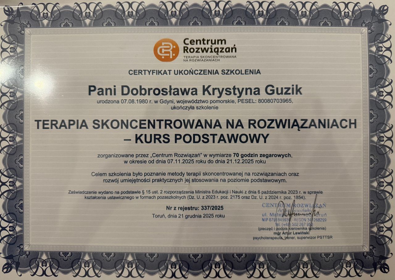 Jestem psychologiem pracującym w nurcie Terapii Skoncentrowanej na Rozwiązaniach (TSR). Posiadam również wykształcenie pedagogiczne.