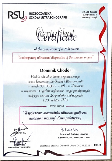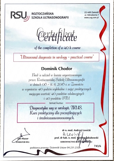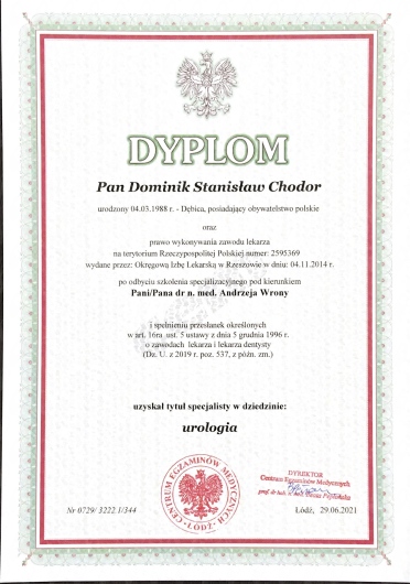 Dzień dobry! Nazywam się Dominik Chodor i jestem lekarzem urologiem. Urolog to lekarz, który zajmuje się chorobami układu moczowego u kobiet i mężczyzn oraz chorobami męskich narządów płciowych, czyli inaczej mówiąc diagnozuję i leczę schorzenia nerek, pęcherza, prostaty, cewki moczowej, jąder i prącia. Studiowałem na Wydziale Lekarskim Collegium Medicum Uniwersytetu Jagiellońskiego w Krakowie. Studia ukończyłem z wyróżnieniem w 2013 roku. Staż podyplomowy odbywałem w Szpitalu Specjalistycznym w Mielcu. W trakcie stażu zdałem Lekarski Egzamin Końcowy i zakwalifikowałem się na specjalizację z urologii. Szkolenie specjalizacyjne odbyłem w Oddziale Urologii Ogólnej i Onkologicznej Szpitala Specjalistycznego w Mielcu. W 2021 roku zdałem europejski egzamin specjalizacyjny uzyskując tytuł specjalisty urologa FEBU (Fellow European Board of Urology).
