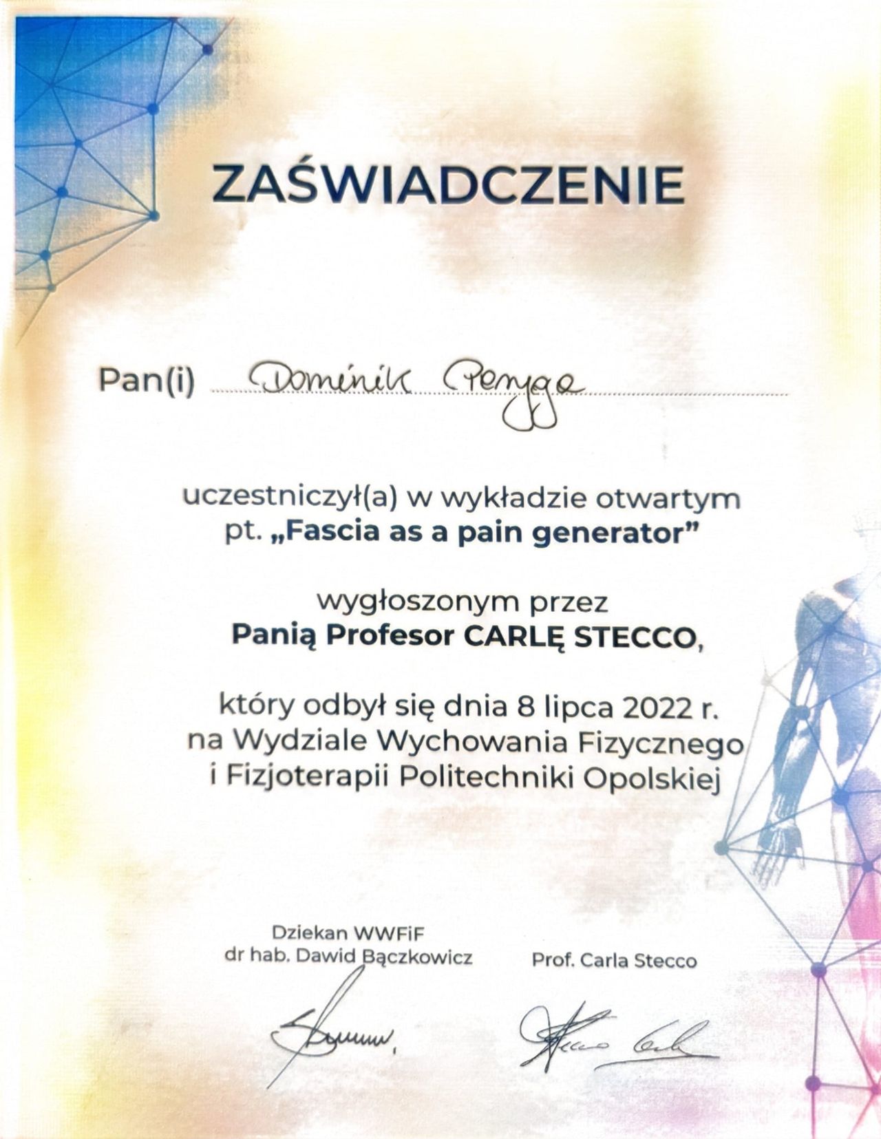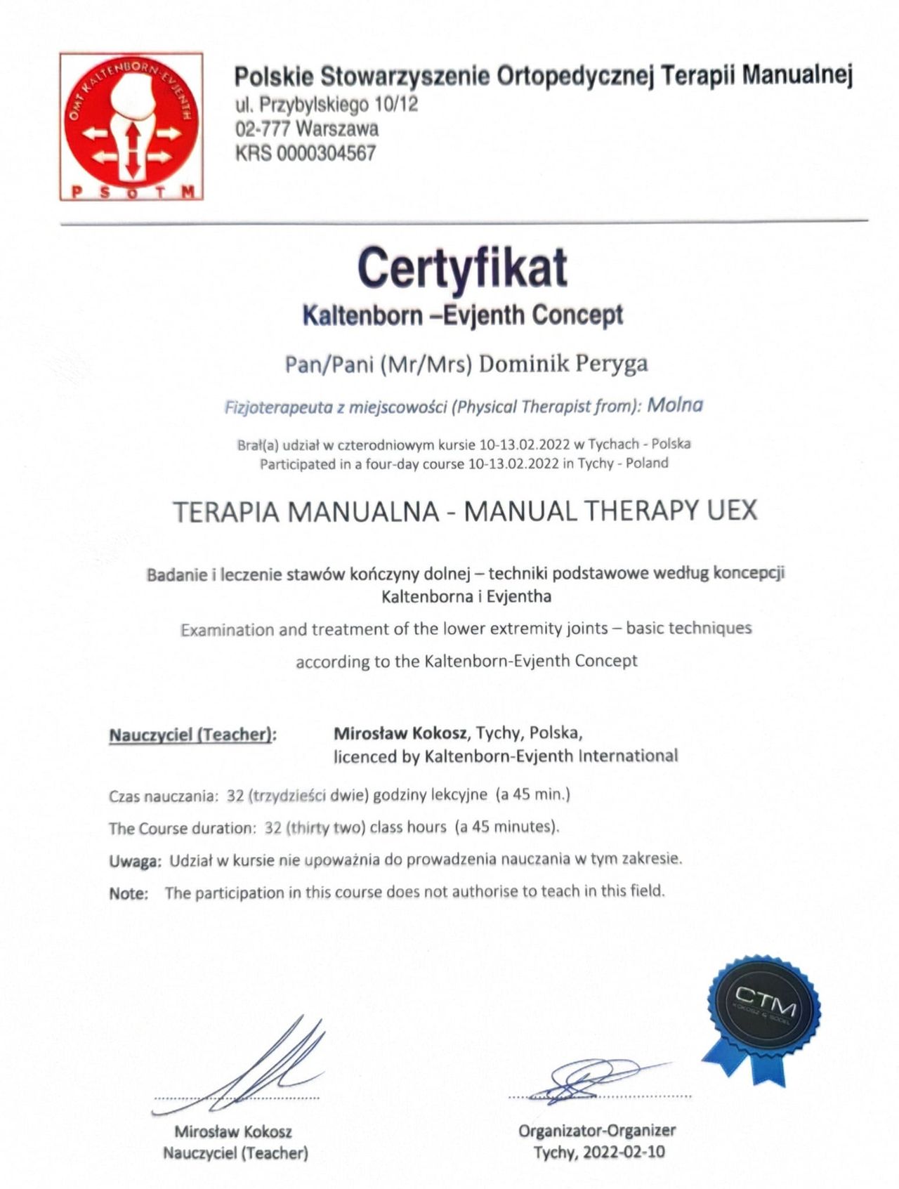 Dzień dobry, jestem absolwentem Politechniki Opolskiej którą ukończyłem z tytułem Magister Fizjoterapii. Pracuję głównie za pomocą Ortopedycznej Terapii Manualnej, której jestem certyfikowanym użytkownikiem. Dzięki szczegółowemu badaniu jestem w stanie zlokalizować bolesny nerw, staw lub mięsień. W badaniu szukam, które struktury mają za dużo ruchomości, a które za mało. Za pomocą technik manualnych wdrażam leczenie najpierw ukierunkowane na wyleczenie bólu, następnie nad przywróceniem prawidłowej pracy bolesnej okolicy. W mojej pracy staram się patrzeć na człowieka jako całość, nie biorę pod uwagę jedynie bolesnych struktur ale szukam przyczyny powstawania dolegliwości. Głównie pracuję z pacjentami, którzy szukają pomocy w uśmierzeniu bólu lecz często pomagam również osobom po wszelakich złamaniach, protezach, skręceniach, zerwaniach czy operacjach związanych z aparatem ruchu.