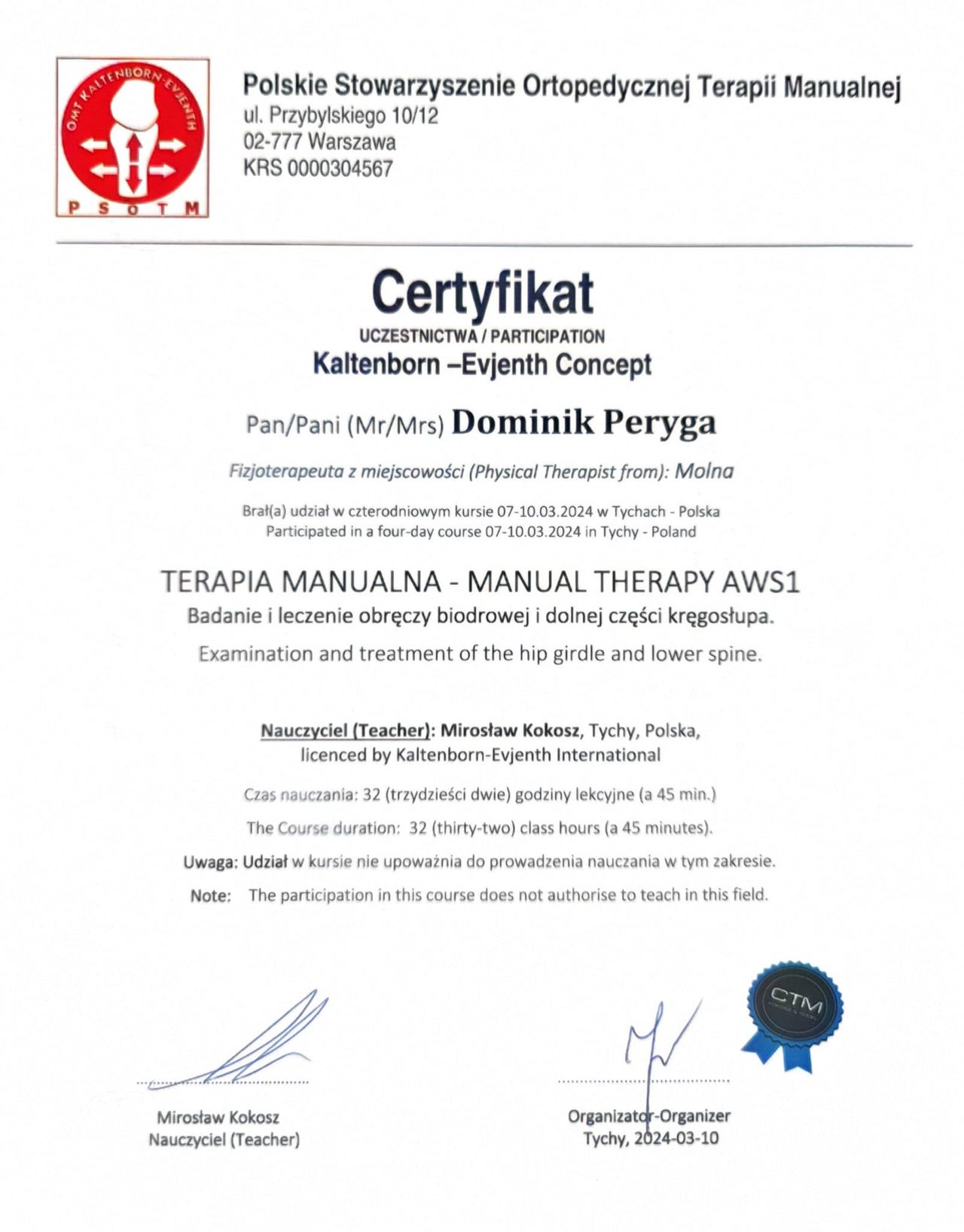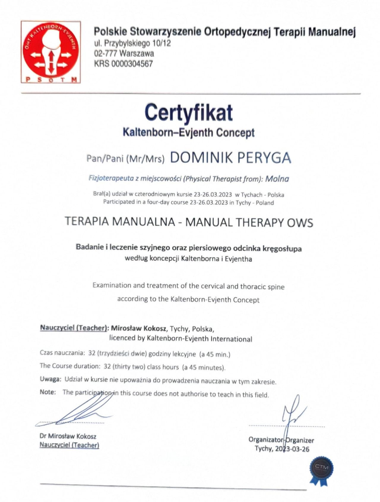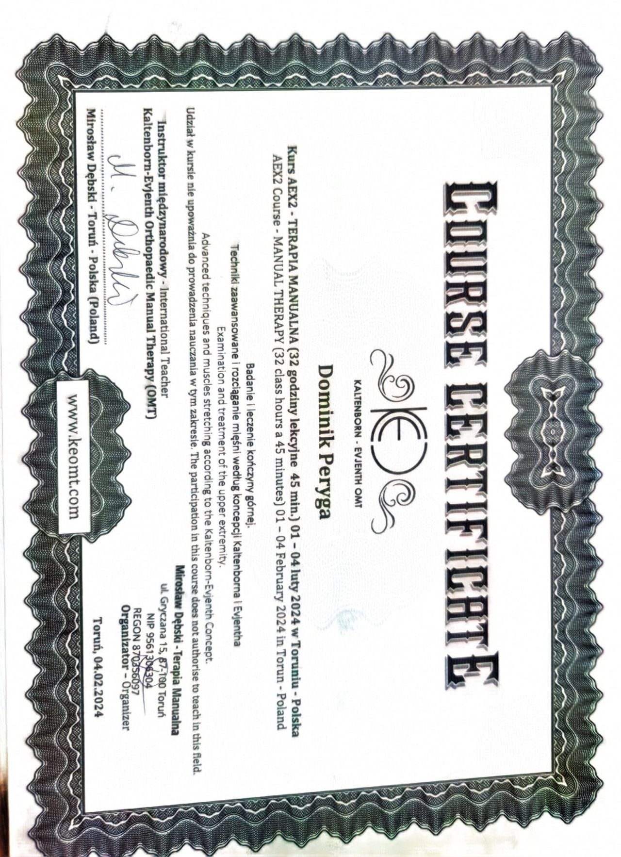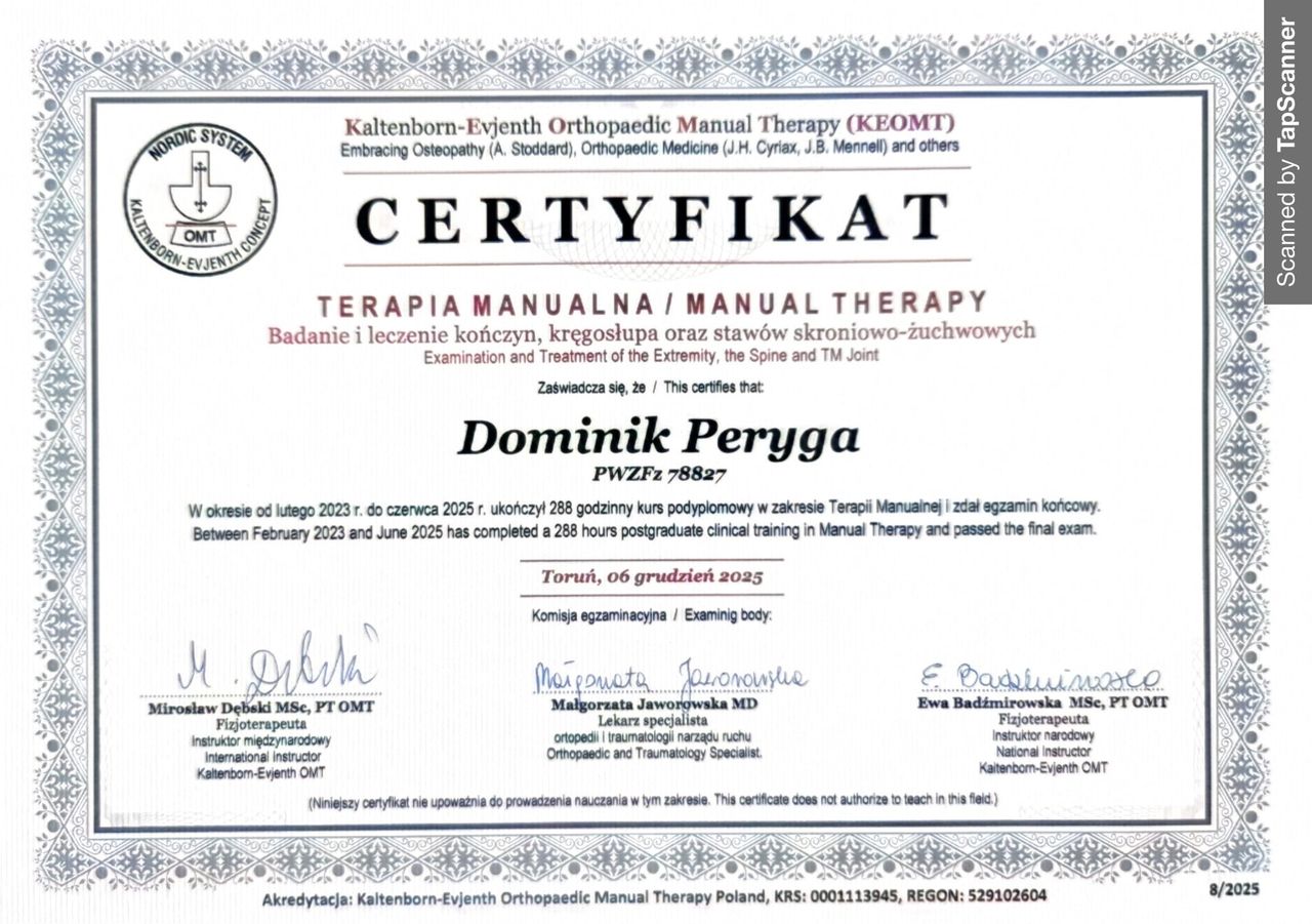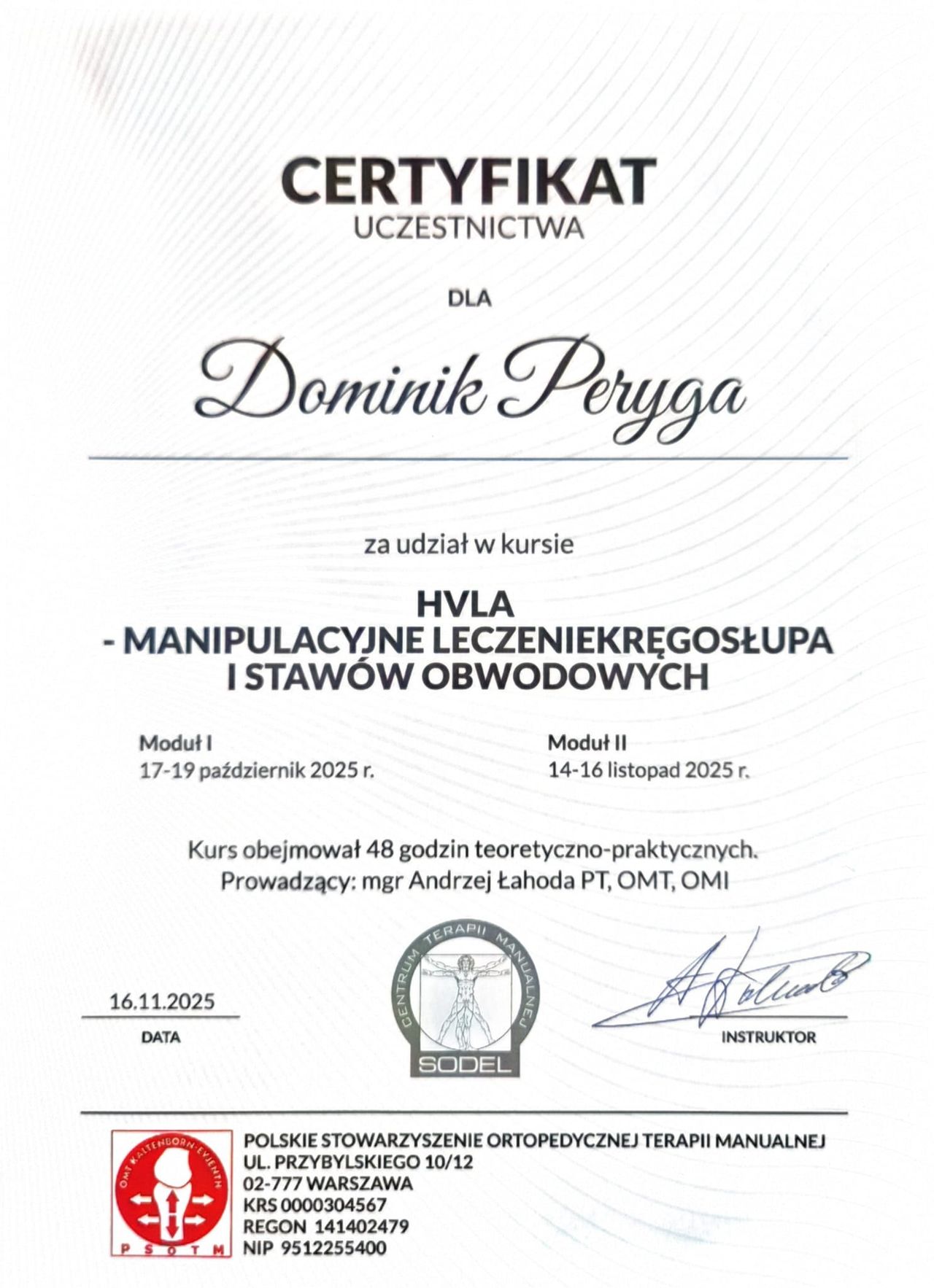 Profesjonalne podejście do pacjenta, szczegółowy wywiad i badanie, delikatna i bezbolesna terapia. Już po dwóch wizytach widoczna poprawa samopoczucia i zmniejszenie dolegliwości bólowych. Serdecznie polecam Pana Dominika.