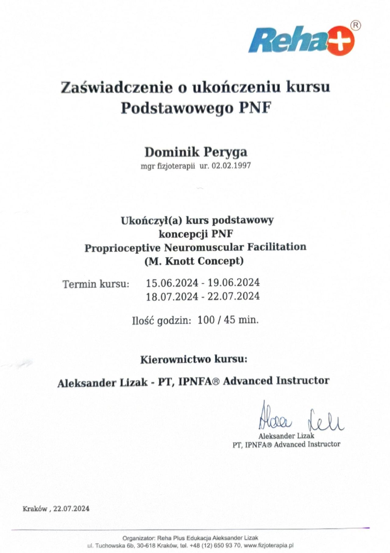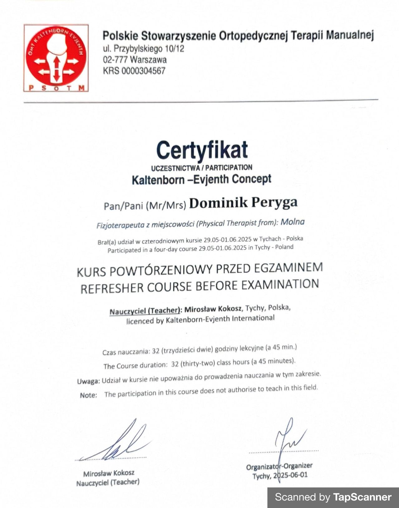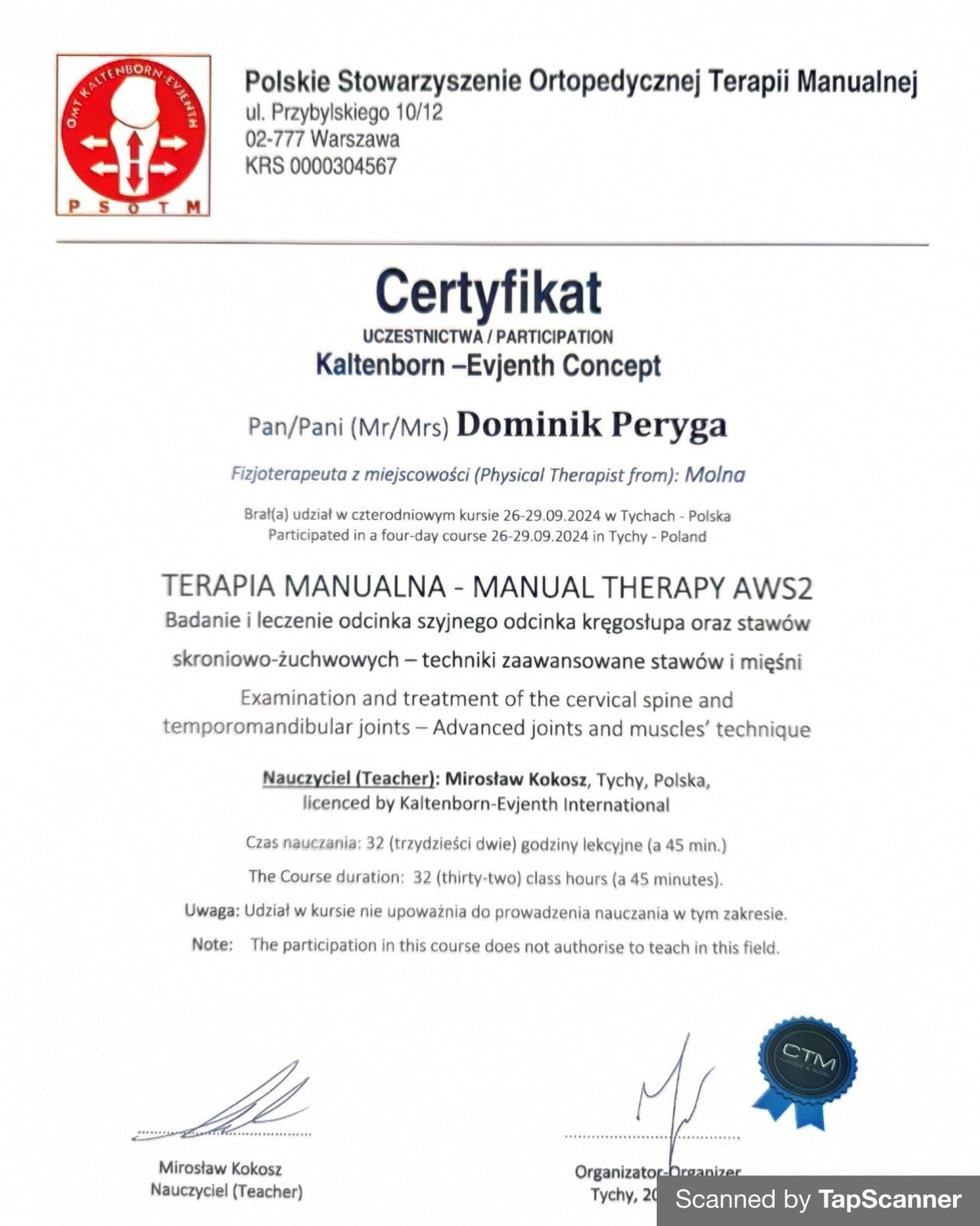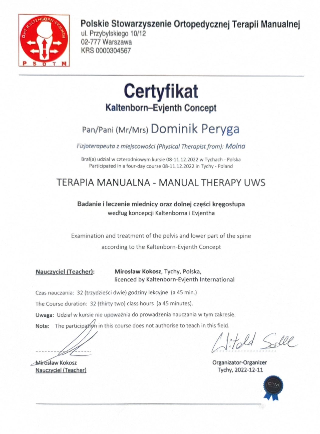 Profesjonalne podejście do pacjenta, szczegółowy wywiad i badanie, delikatna i bezbolesna terapia. Już po dwóch wizytach widoczna poprawa samopoczucia i zmniejszenie dolegliwości bólowych. Serdecznie polecam Pana Dominika.