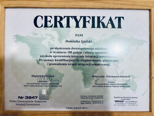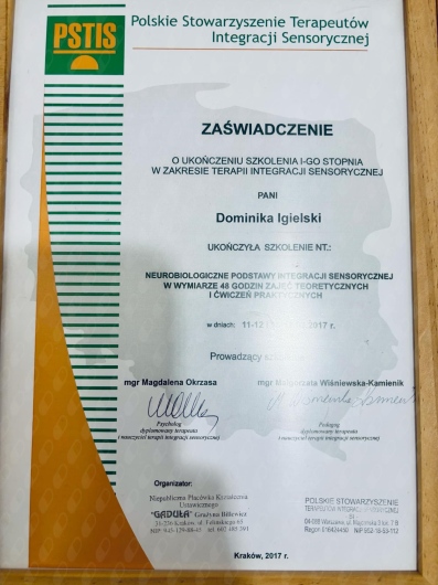 Jesteśmy we współpracy z Panią Dominiką od dłuższe czasu. Córka czuje się u Pani Dominiki bezpiecznie, jest zadowolona po każdych zajęciach i chętnie uczestniczy w nich za każdym razem. Córka urodziła się jako wcześniak, ma spowolniony rozwój i nadwrażliwość sensoryczną. Podczas terapii udało się u niej wypracować uważność, umiejętności małej motoryki i zniwelować nadwrażliwość sensoryczną. Bardzo polecam !