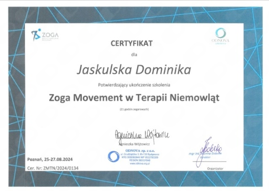 Chciałabym serdecznie polecić Panią Dominikę jako fizjoterapeutę dziecięcego. Jest to osoba o niezwykłym profesjonalizmie, która z ogromnym zaangażowaniem podchodzi do swojej pracy. Je podejście do naszego synka było pełne ciepła, cierpliwości i empatii – każde spotkanie to nie tylko terapia, ale także czas, w którym synek czuło się bezpiecznie i spokojnie.