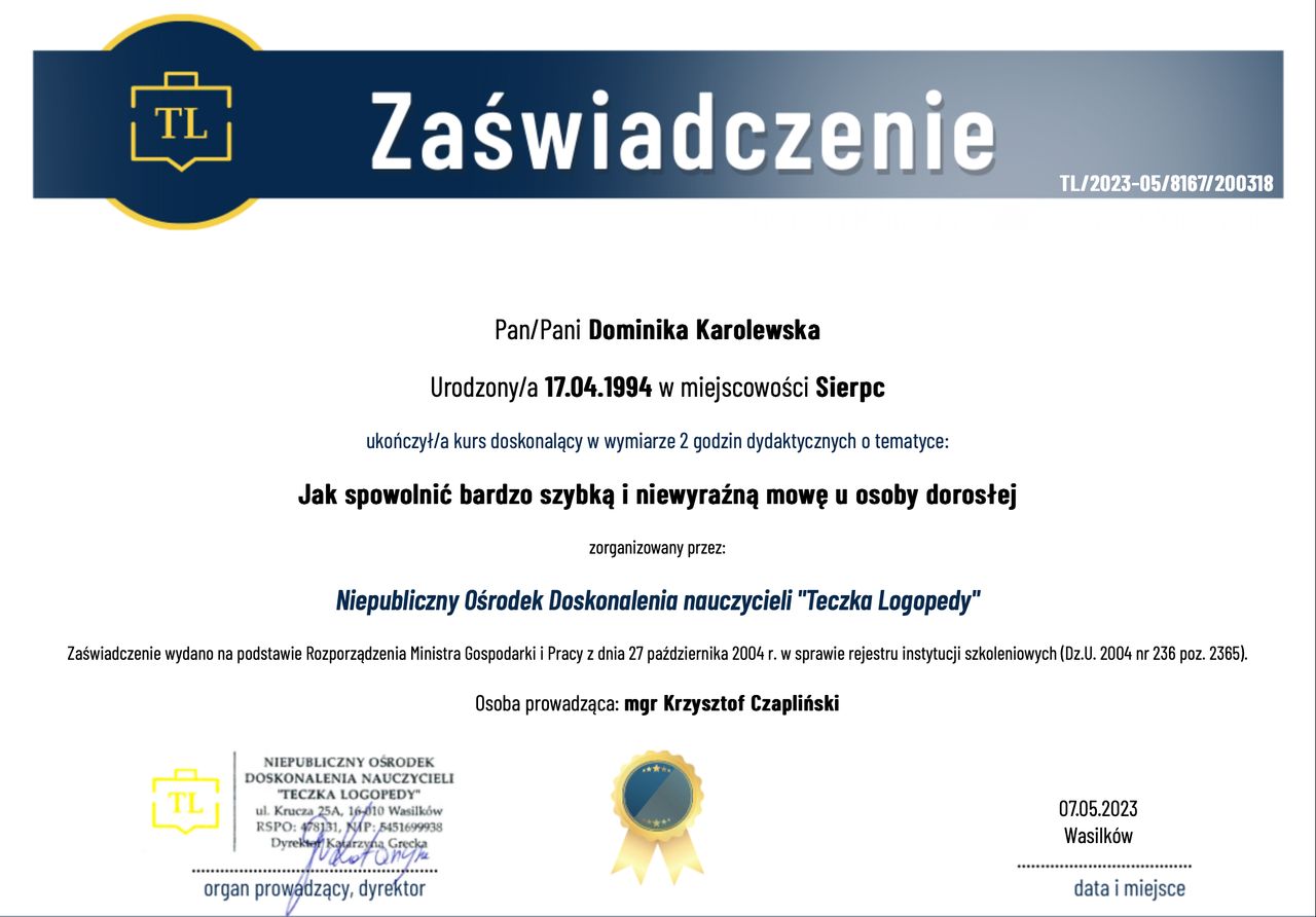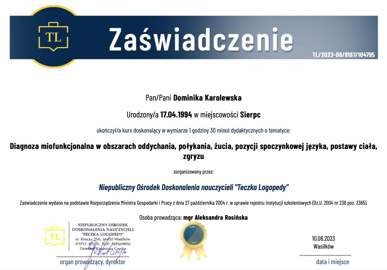 Bardzo dziękujemy za tak miłe słowa. Neurologopeda z empatią pani Dominiki to skarb. Prosimy pamiętać o wizytach kontrolnych.