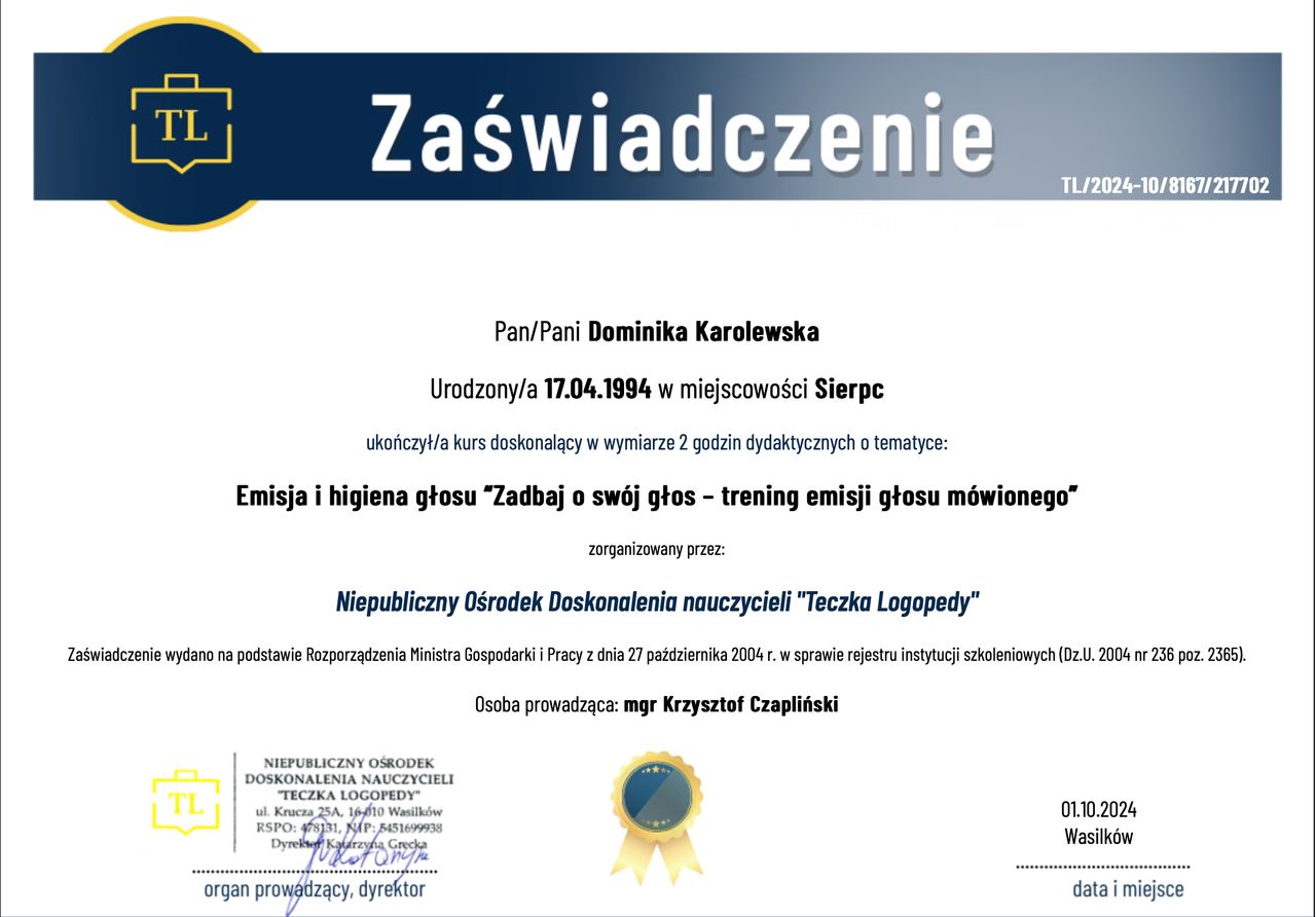 Jaki jest zakres porad oferowanych przez Dominika Karolewska?Dominika Karolewska to logopeda. Na podstawie swojego doświadczenia i wykształcenia Dominika Karolewska oferuje usługi takie jak: konsultacja logopedyczna.