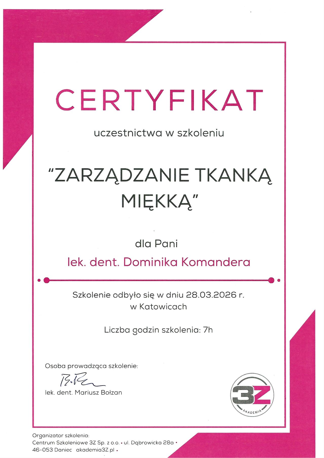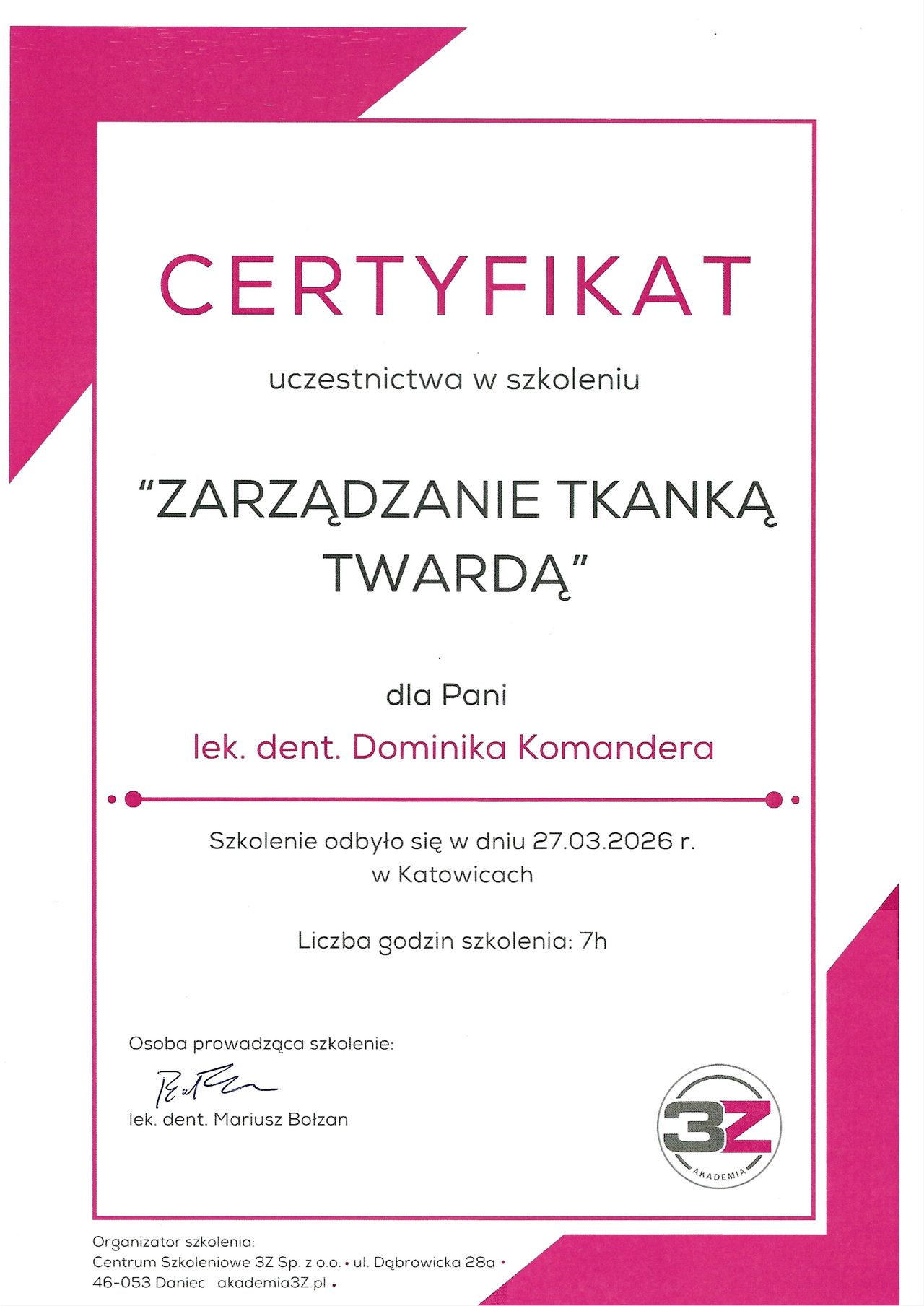 W codziennej pracy kieruję się zasadami evidence-based dentistry (EBD) – wybieram metody oparte na najnowszych badaniach naukowych, by zapewnić moim pacjentom leczenie skuteczne, bezpieczne i komfortowe. Stale podnoszę kwalifikacje, uczestnicząc w kursach i szkoleniach w kraju i za granicą.