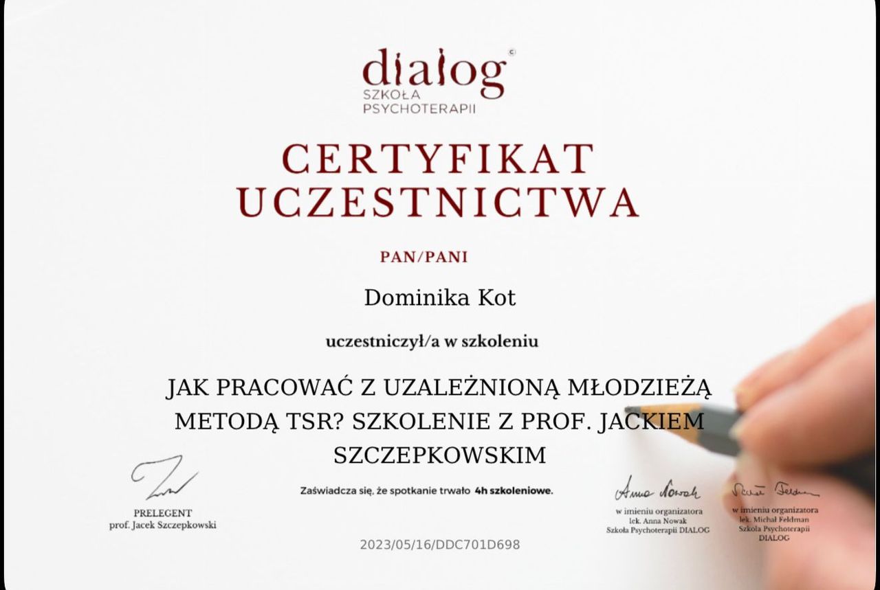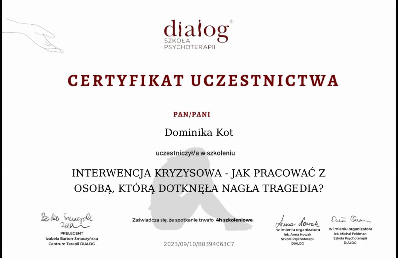 Już po pierwszej rozmowie czuje się, że jest się traktowanym na równi i rozumianym, co jest podstawą każdej relacji terapeuta-pacjent. Dzięki dobrym wyjaśnieniom złożonych zależności szybko mogłam uzyskać obraz "zaburzenia" i dzięki współczesnym metodom sprawnie osiągnąć pierwsze sukcesy, co niestety nie miało miejsca po intensywnej psychoterapii gdzie indziej. U Pani Dominiki Kot kompetencja spotyka się z osobistymi doświadczeniami, co daje osobie dotkniętej problemem wsparcie i uspokojenie. Jest profesjonalna, a jednocześnie w odpowiednich momentach wprowadza humor, co jest bardzo pomocne. Jestem jej wdzięczna za wszystko co dla mnie robi i polecam ją z całego serca.