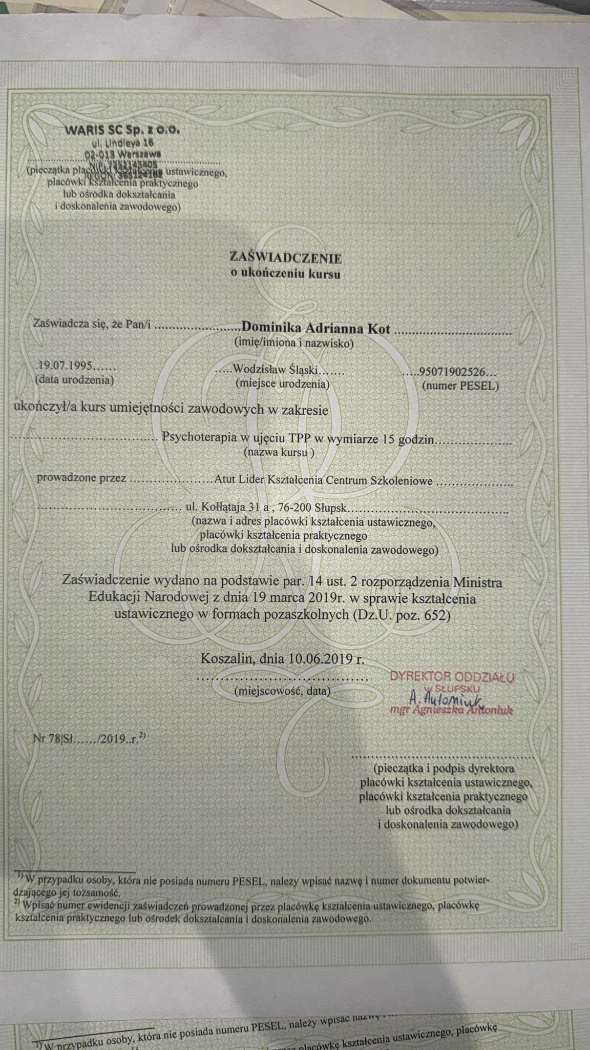 w Gdańsku. W 2019 roku ukończyłam kurs podstawowy psychoterapii w ujęci TPP. Od 2023