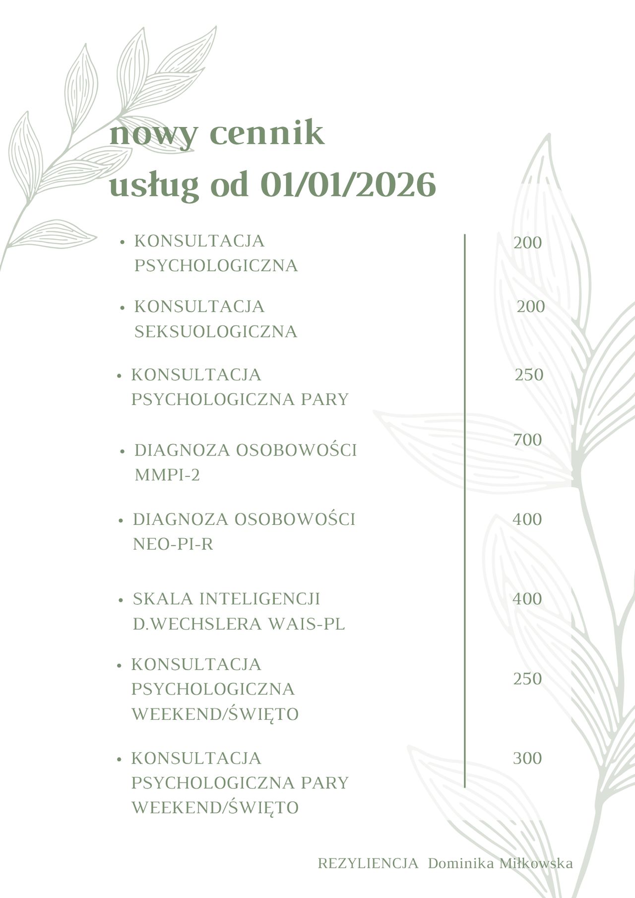 Drodzy Państwo informuję iż wraz z dniem 01/01/2026 nastąpi zmiana cennika. Zapraszam do zapoznania się z nadchodzącymi zmianami. Nowy cennik dostępny jest także w gabinecie.