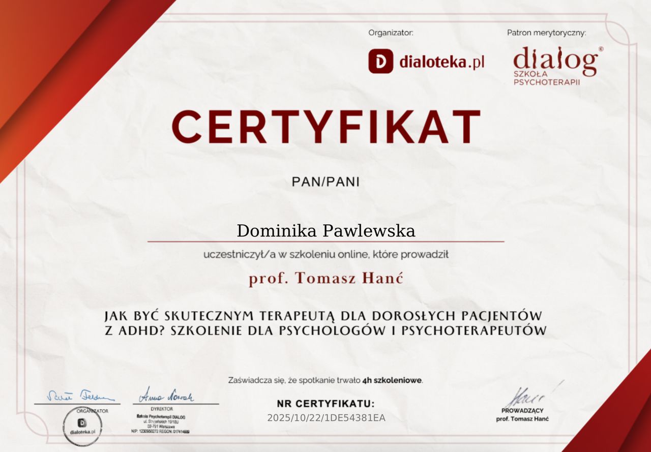 Wizyta przebiegła w bardzo przyjaznej atmosferze. Pani Dominika uważnie słucha, zadaje trafne pytania i pomaga spojrzeć na problem z innej perspektywy. Czułam się wysłuchana i zrozumiana.