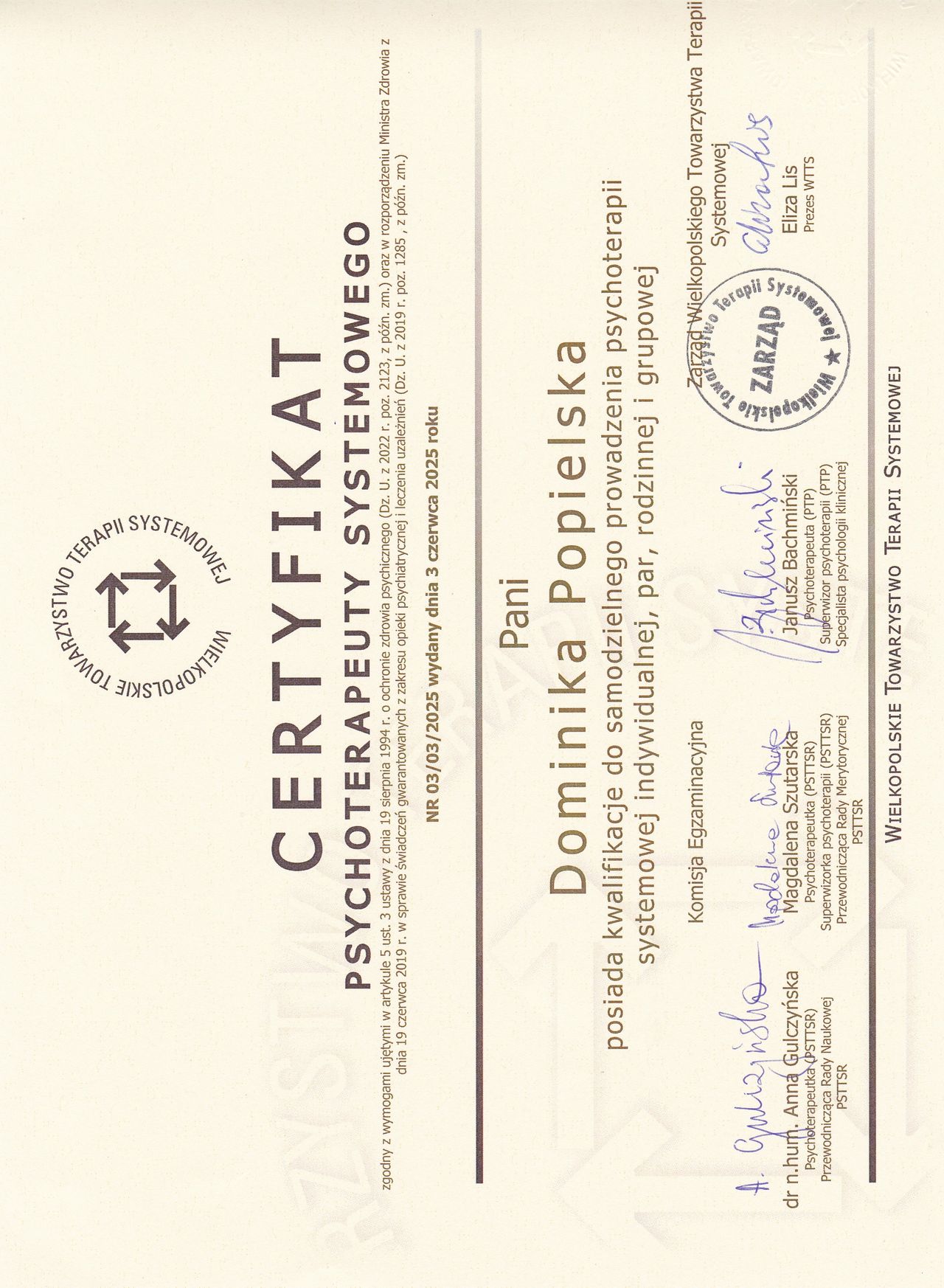 Ukończyłam całościowe szkolenie i posiadam kwalifikacje do prowadzenia psychoterapii systemowej indywidualnej, par, rodzinnej i grupowej.
