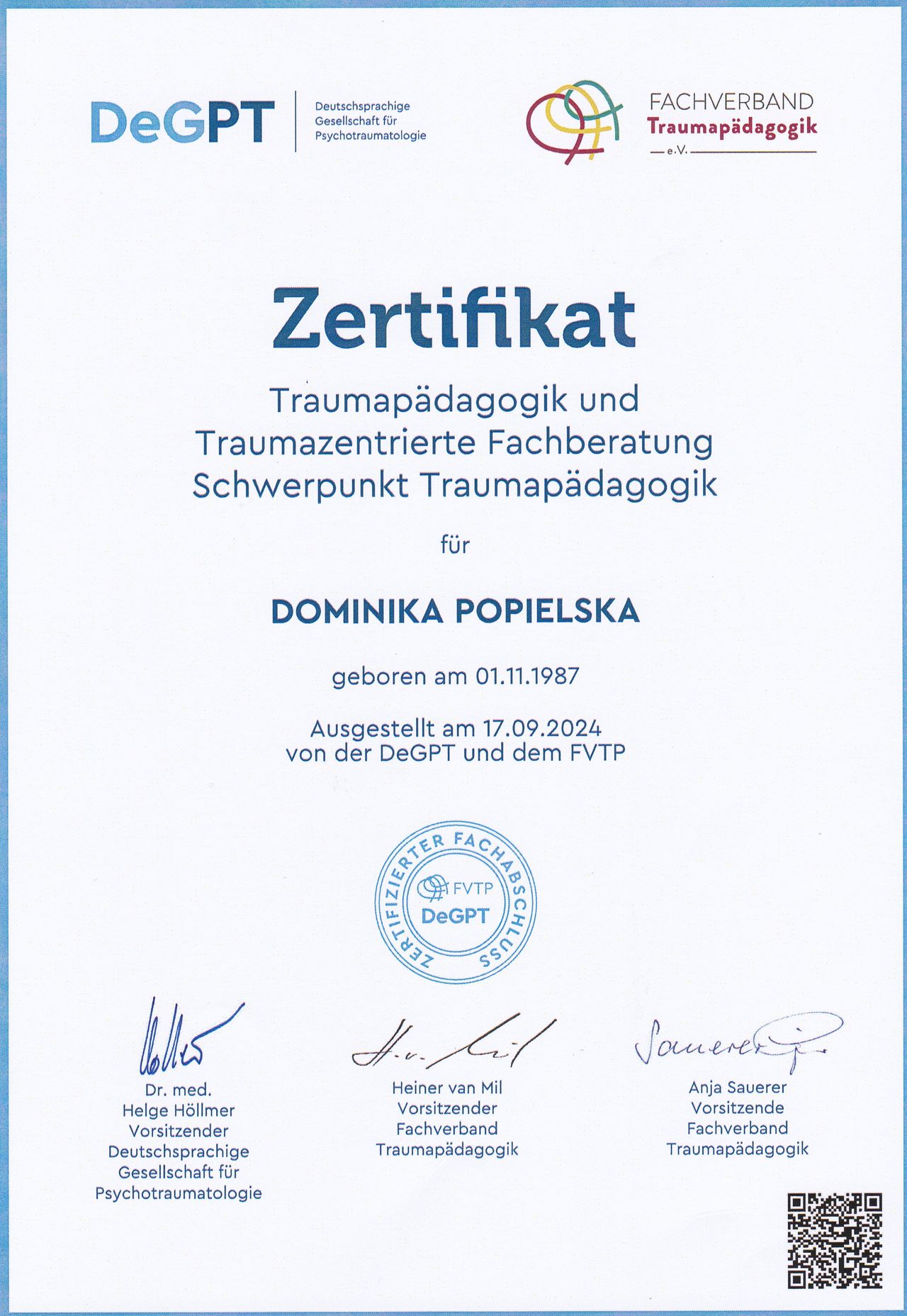 Posiadam również Certyfikat Pedagogiki Traumy i Specjalistycznego Doradztwa w Zakresie Terapii Traumy wydane przez niemieckie towarzystwo DeGPT.