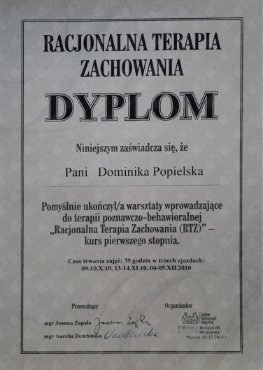 W swojej pracy jako psychoterapeuta korzystam także z wiedzy uzyskanej w ramach szkoleń z zakresu Analizy Transakcyjnej rekomendowanych przez Polskie Towarzystwo Analizy Transakcyjnej oraz kursu pierwszego stopnia Racjonalnej Terapii Zachowania (RTZ).