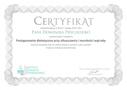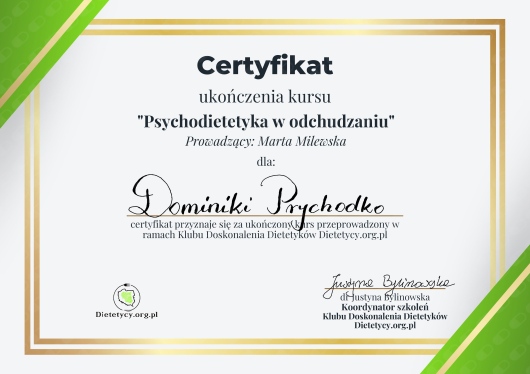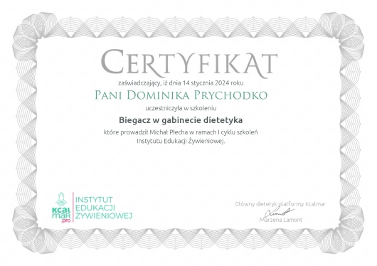 Jaki jest zakres porad oferowanych przez Dominika Prychodko?Dominika Prychodko to dietetyk. Na podstawie swojego doświadczenia i wykształcenia Dominika Prychodko oferuje usługi takie jak: Konsultacja dietetyczna, konsultacja dietetyczna + jadłospis 7-dniowy, Druga konsultacja dietetyczna wraz z jadłospisem /szablonem posiłków, konsultacja online, konsultacja online (kolejna), jadłospis 7-dniowy.