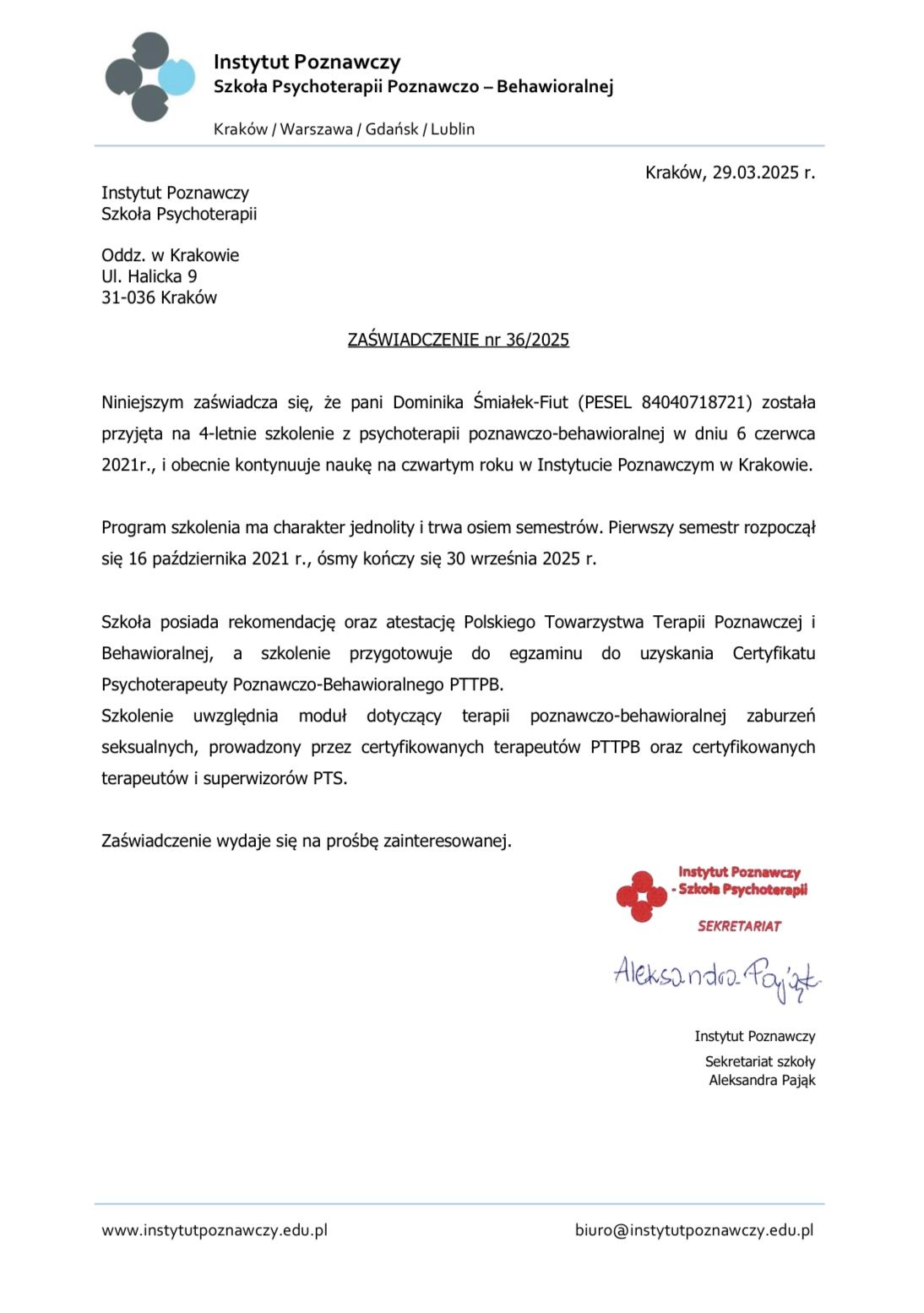 Jestem w trakcie odbywania 4-letniego certyfikowanego kursu Psychoterapii Poznawczo-Behawioralnej w Instytucie Poznawczym w Krakowie. Ponadto jestem członkiem Polskiego Towarzystwa Terapii Poznawczo-Behawioralnej.