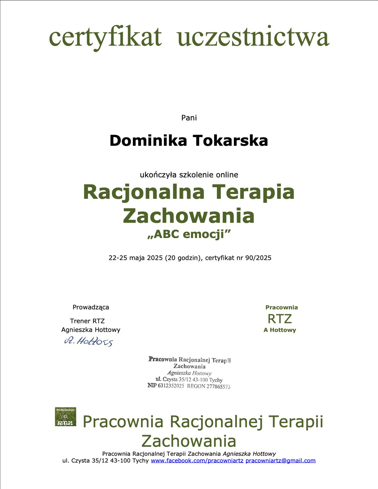 Jestem dyplomowanym psychologiem w trakcie całościowego, czteroletniego szkolenia psychoterapeutycznego w nurcie poznawczo-behawioralnym (CBT). W swojej pracy korzystam także z metody jaką jest Racjonalna Terapia Zachowania (RTZ).
