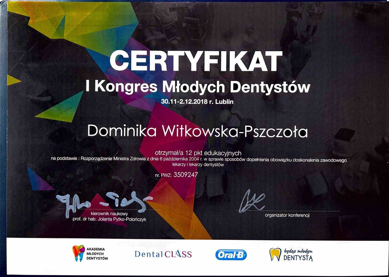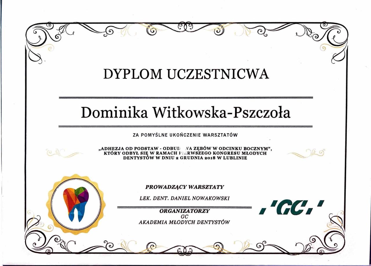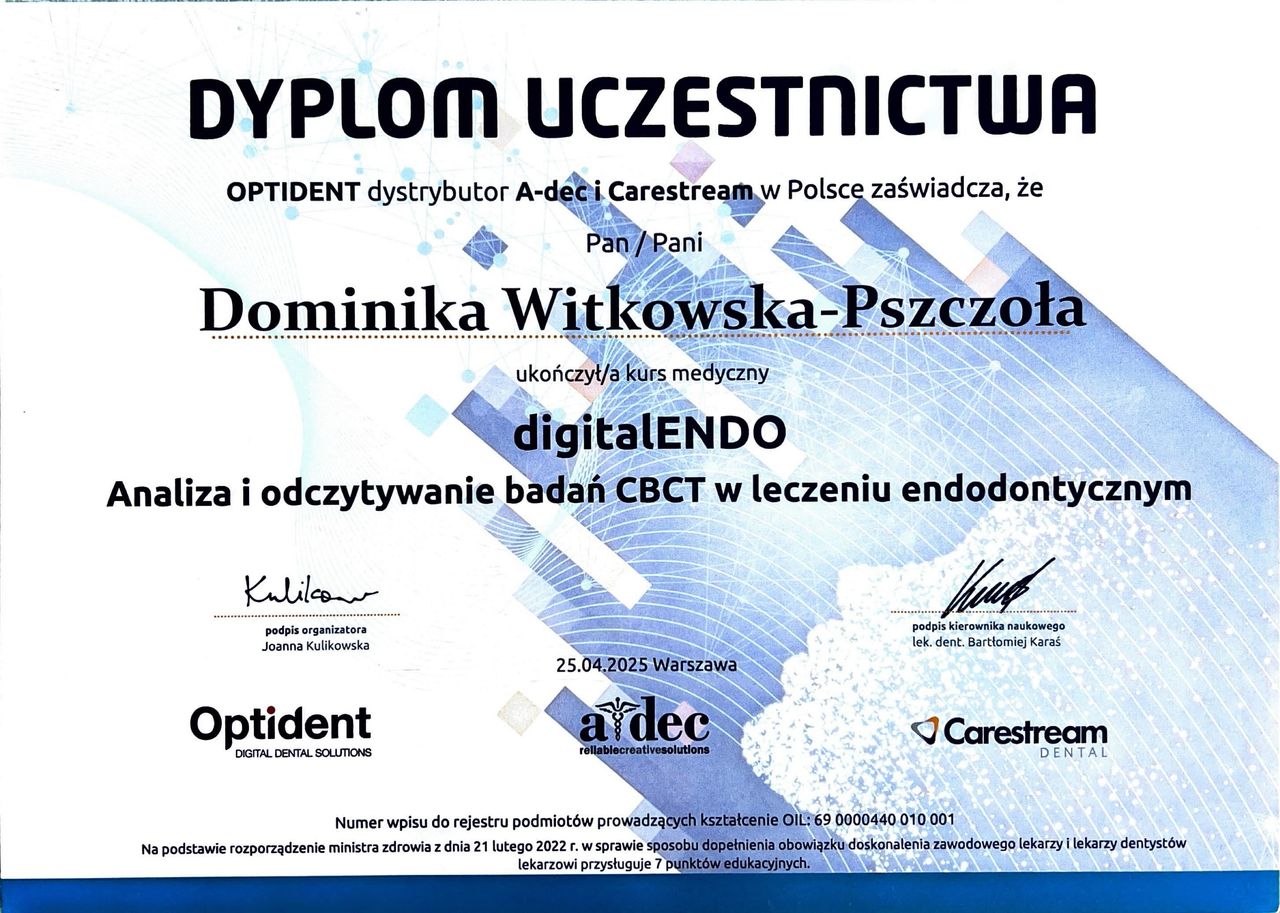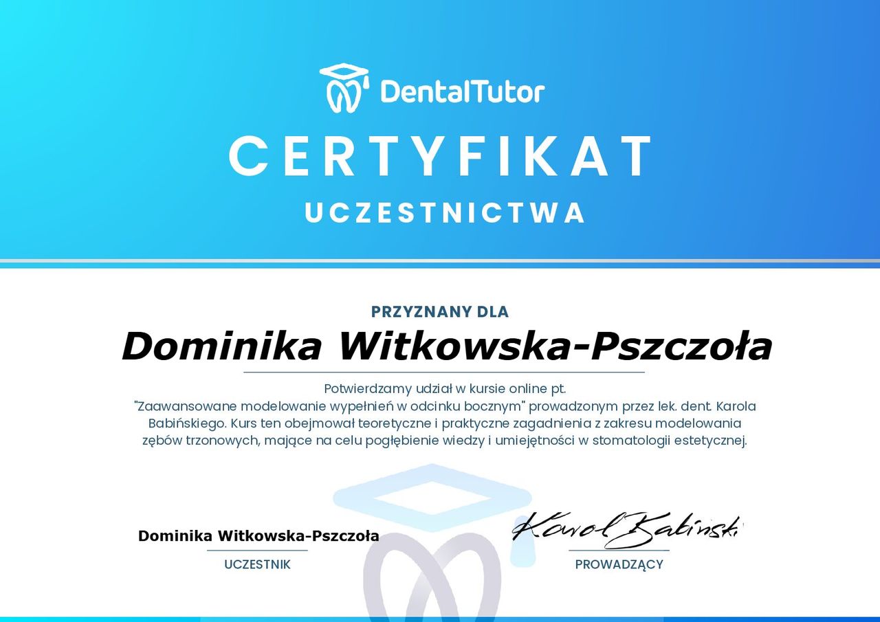 Pani Dominika Witkowska-Pszczoła to dentystka z prawdziwym powołaniem! Profesjonalna, delikatna i pełna empatii – dzięki niej każda wizyta przebiega w spokojnej i przyjaznej atmosferze. Miałem wykonywane leczenie kanałowe i byłem mile zaskoczony, jak wszystko bezboleśnie i sprawnie przebiegło. Pani doktor dokładnie tłumaczy każdy etap zabiegu, co daje ogromne poczucie bezpieczeństwa i komfortu. Zdecydowanie polecam każdemu, kto szuka dobrego dentysty i chce zadbać o swój uśmiech w komfortowych warunkach.