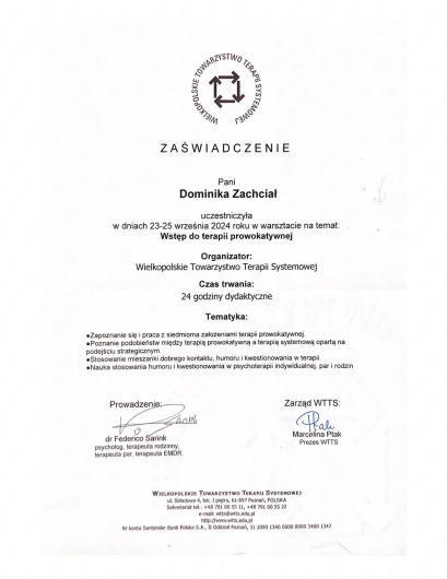 Jestem Członkinią Nadzwyczajną Wielkopolskiego Towarzystwa Terapii Systemowej.