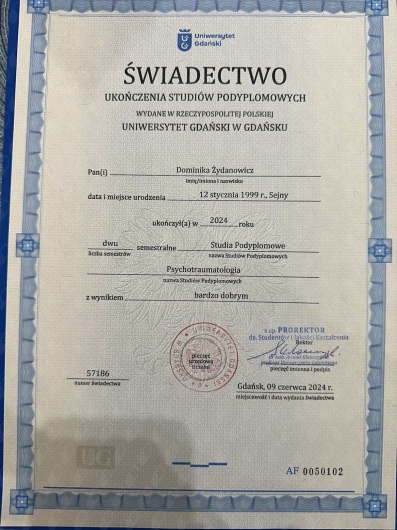 Jaki jest zakres porad oferowanych przez Dominika Żydanowicz?Dominika Żydanowicz to psycholog, psychotraumatolog. Na podstawie swojego doświadczenia i wykształcenia Dominika Żydanowicz oferuje usługi takie jak: interwencja kryzysowa, poradnictwo psychologiczne.
