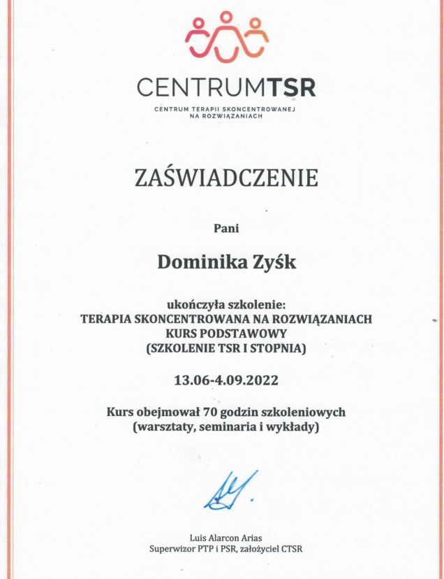 Z pełnym przekonaniem polecam Panią Dominikę jako terapeutkę. Jest osobą niezwykle zaangażowaną, rzetelną i profesjonalną. Potrafi w bardzo trafny sposób zidentyfikować problem i przeprowadzić przez najtrudniejsze tematy. Sesje są prowadzone w atmosferze zrozumienia i wsparcia. Cieszę się, że trafiłam właśnie do tej specjalistki i z pewnością będę kontynuować terapię pod jej opieką.